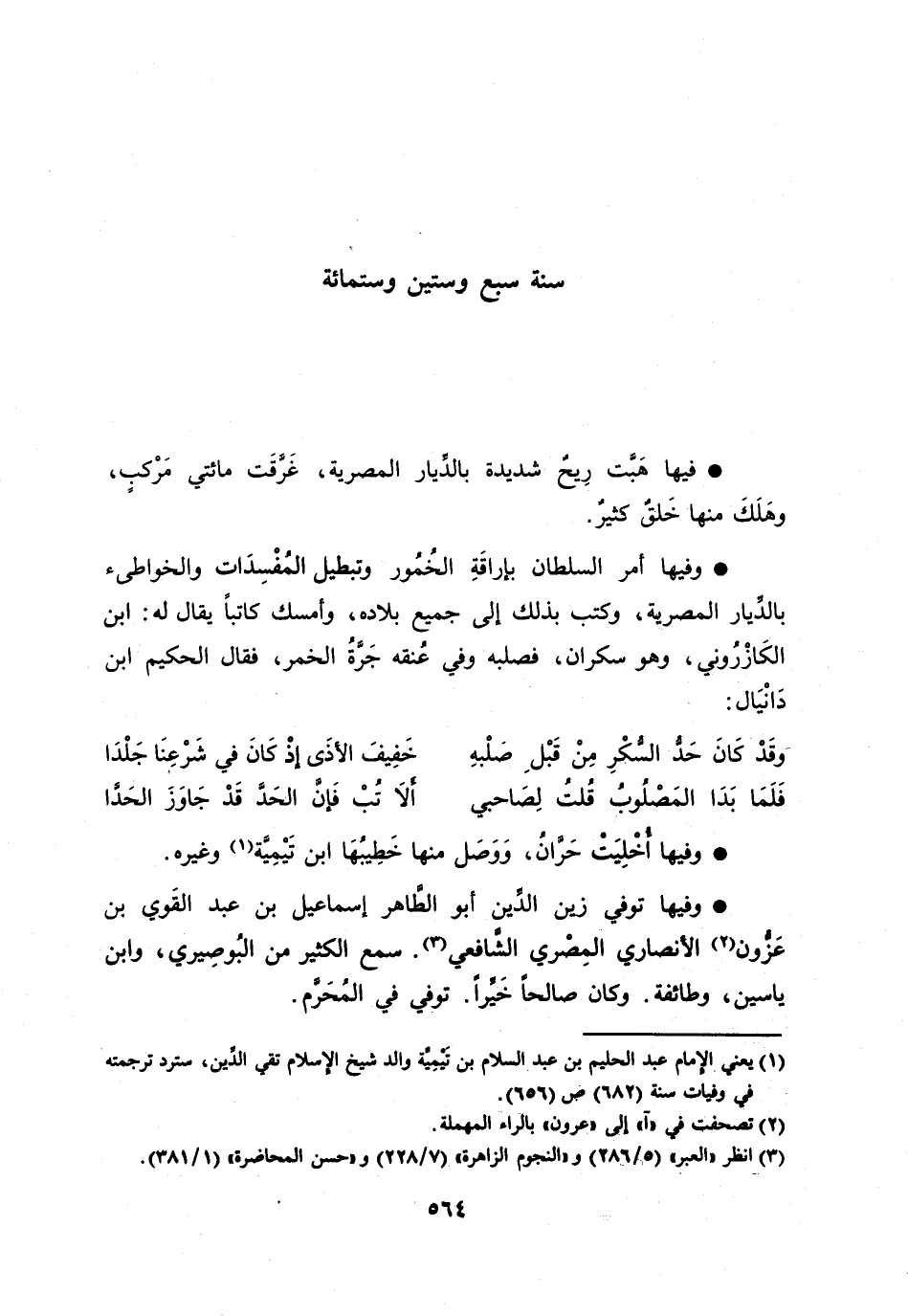 وفيها أمر السلطان بإراقة الخمور وتبطيل المفسدات والخواطئ بالدّيار المصرية، وكتب بذلك إلى جميع بلاده، وأمسك كاتبا يقال له: ابن الكازروني، وهو سكران، فصلبه وفي عنقه جرّة الخمر، فقال الحكيم ابن دانيال: