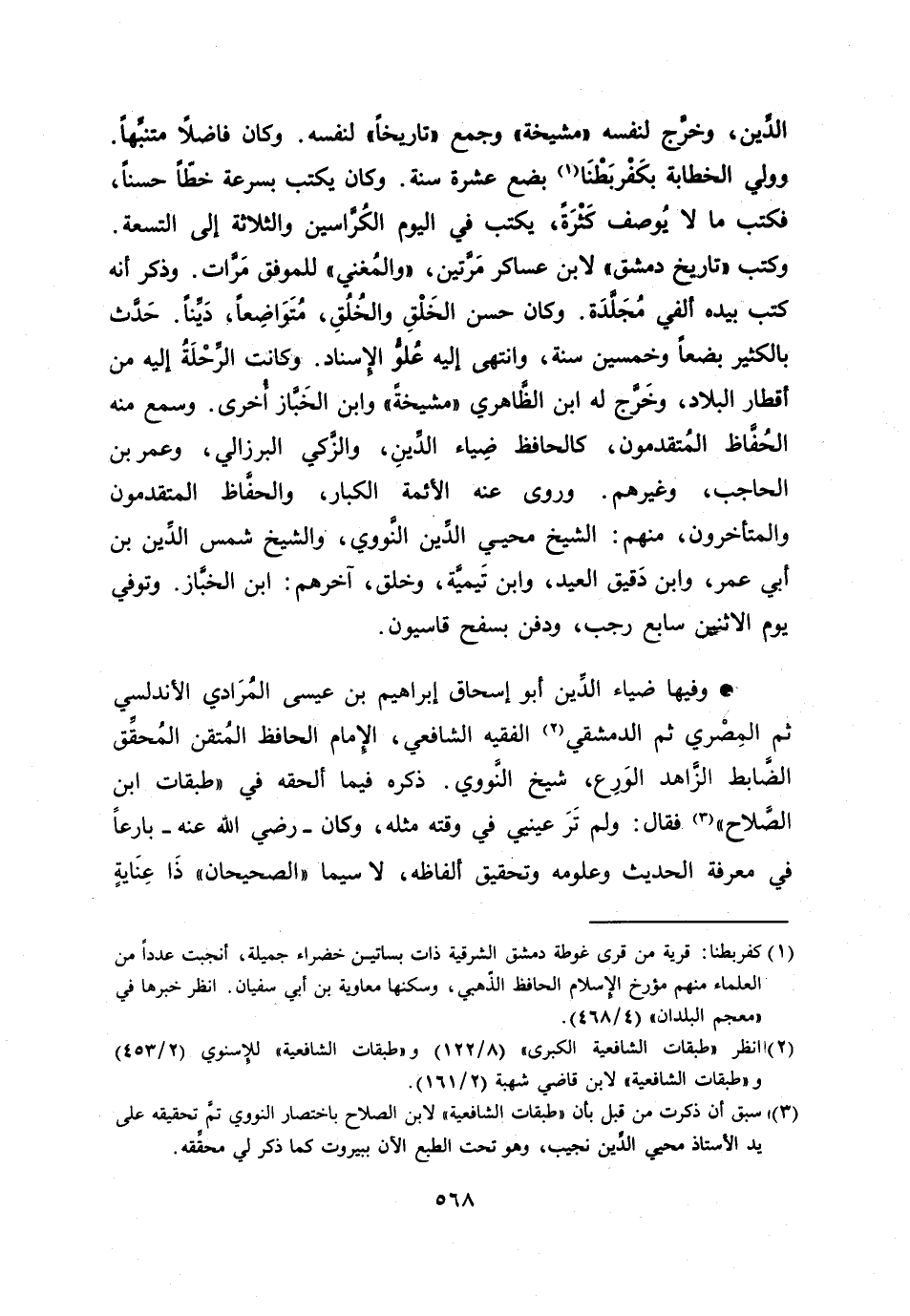 [3] سبق أن ذكرت من قبل بأن «طبقات الشافعية» لابن الصلاح باختصار النووي تمّ تحقيقه على يد الأستاذ محيي الدّين نجيب، وهو تحت الطبع الآن ببيروت كما ذكر لي محقّقه.