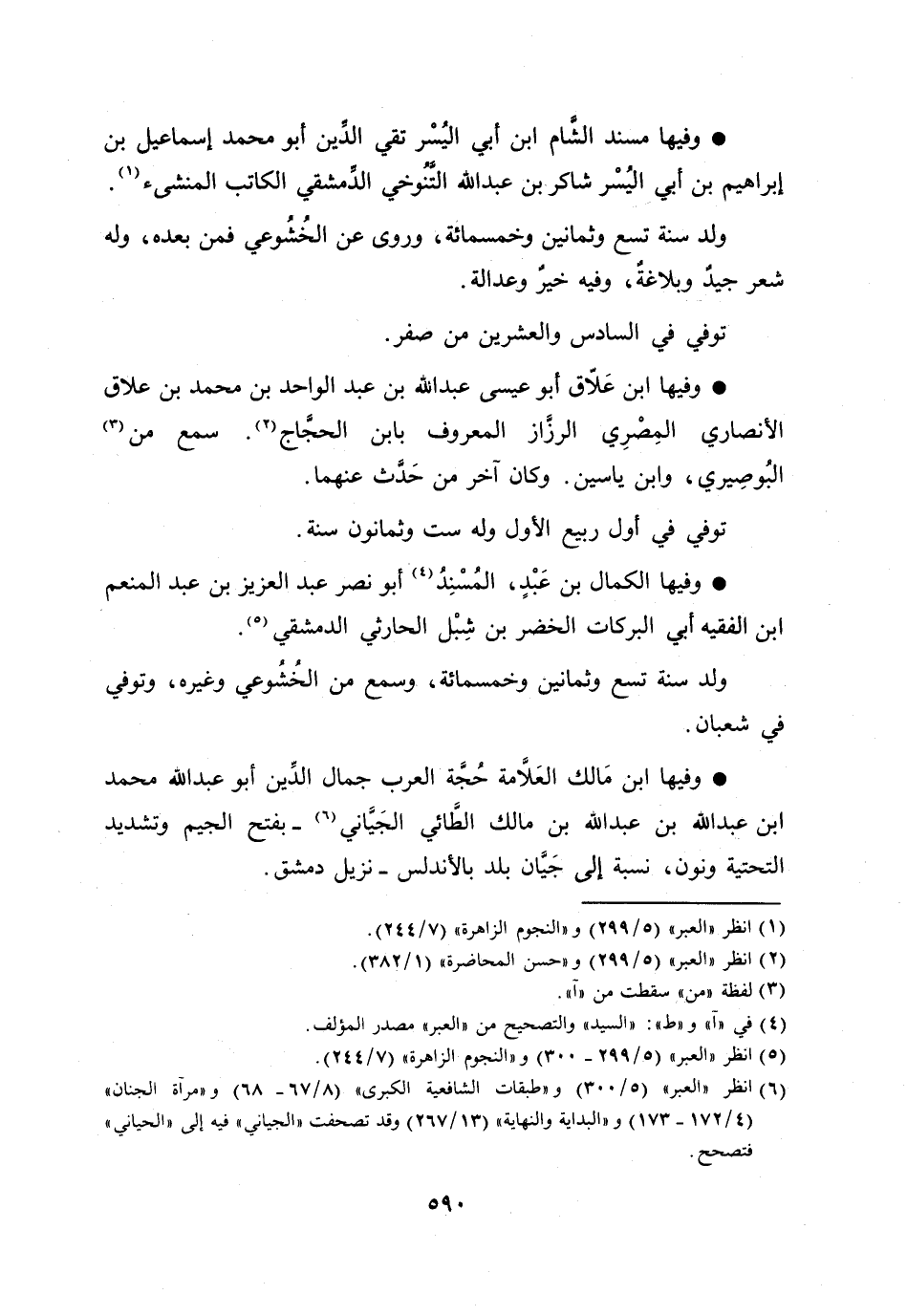 وفيها ابن مالك العلّامة حجّة العرب جمال الدّين أبو عبد الله محمد ابن عبد الله بن عبد الله بن مالك الطّائي الجيّاني [6]- بفتح الجيم وتشديد التحتية ونون، نسبة إلى جيّان بلد بالأندلس- نزيل دمشق.