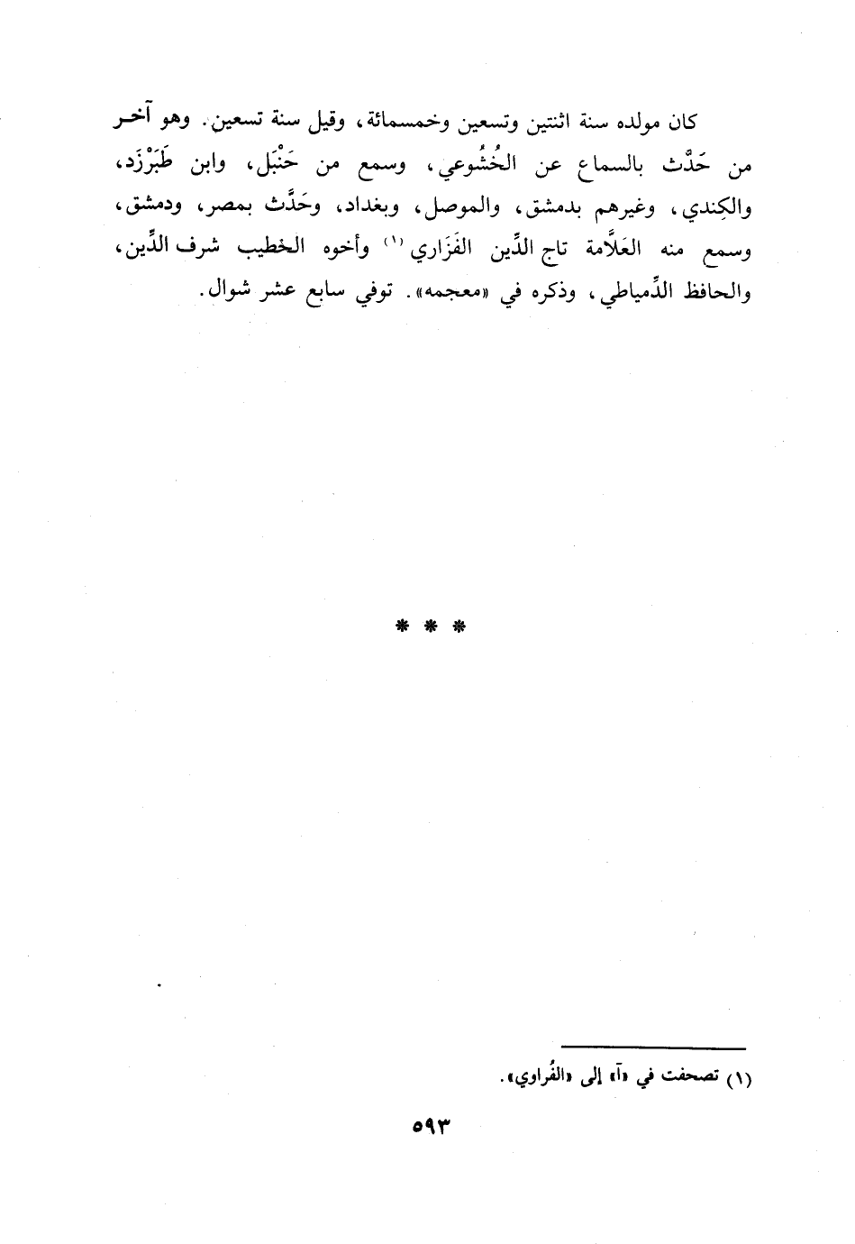 كان مولده سنة اثنتين وتسعين وخمسمائة، وقيل سنة تسعين. وهو آخر من حدّث بالسماع عن الخشوعي، وسمع من حنبل، وابن طبرزد، والكندي، وغيرهم بدمشق، والموصل، وبغداد، وحدّث بمصر، ودمشق، وسمع منه العلّامة تاج الدّين الفزاري [1] وأخوه الخطيب شرف الدّين، والحافظ الدّمياطي، وذكره في «معجمه» . توفي سابع عشر شوال.