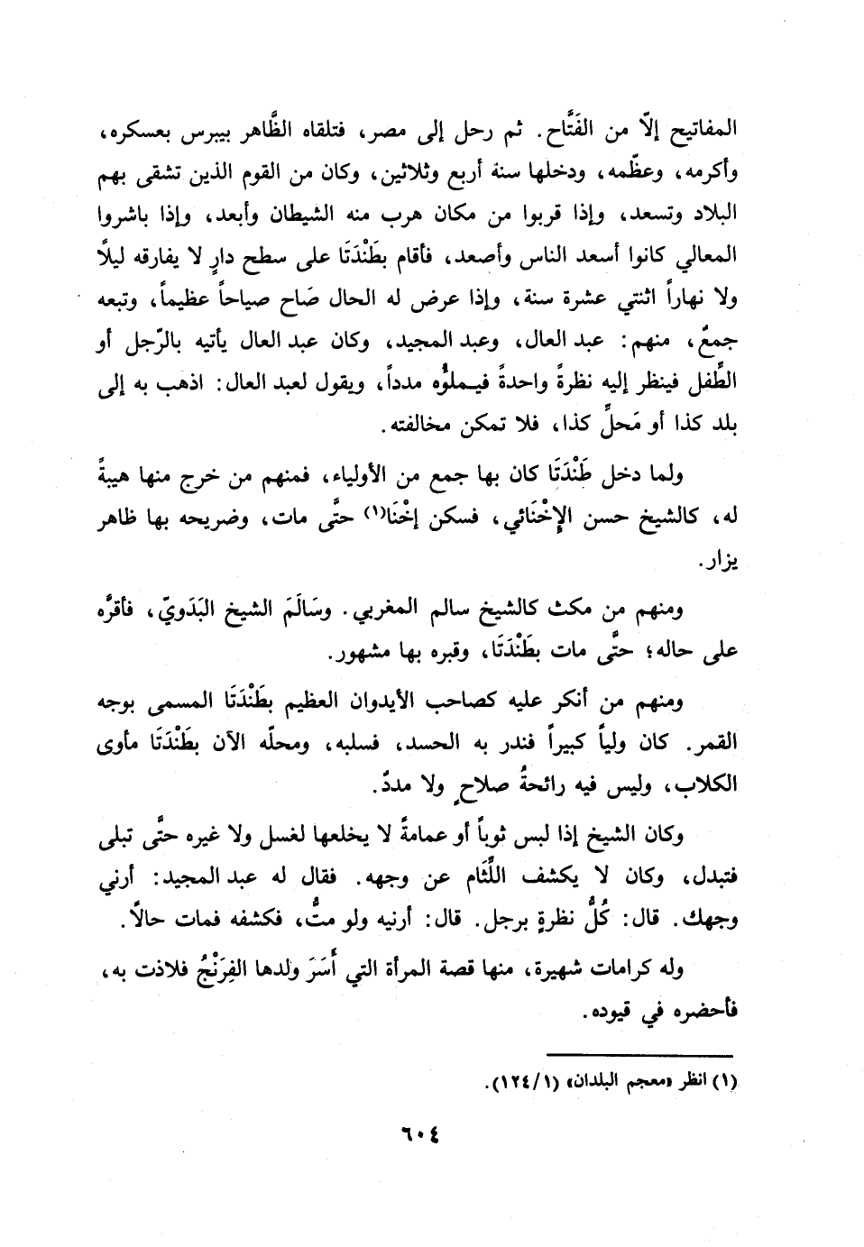 المفاتيح إلّا من الفتّاح. ثم رحل إلى مصر، فتلقاه الظّاهر بيبرس بعسكره، وأكرمه، وعظّمه، ودخلها سنة أربع وثلاثين، وكان من القوم الذين تشقى بهم البلاد وتسعد، وإذا قربوا من مكان هرب منه الشيطان وأبعد، وإذا باشروا المعالي كانوا أسعد الناس وأصعد، فأقام بطندتا على سطح دار لا يفارقه ليلا ولا نهارا اثنتي عشرة سنة، وإذا عرض له الحال صاح صياحا عظيما، وتبعه جمع، منهم: عبد العال، وعبد المجيد، وكان عبد العال يأتيه بالرّجل أو الطّفل فينظر إليه نظرة واحدة فيملؤه مددا، ويقول لعبد العال: اذهب به إلى بلد كذا أو محلّ كذا، فلا تمكن مخالفته.