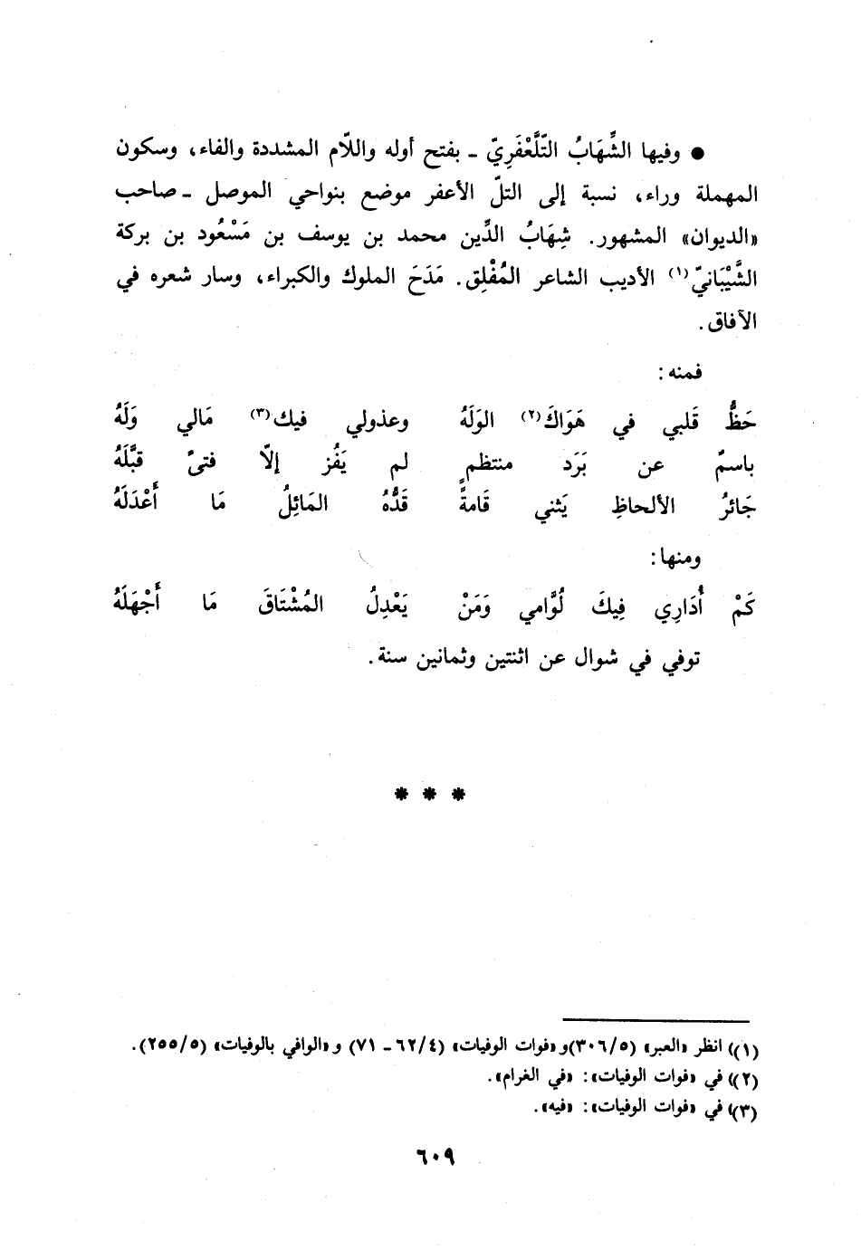 وفيها الشّهاب التّلّعفريّ- بفتح أوله واللّام المشددة والفاء، وسكون المهملة وراء، نسبة إلى التلّ الأعفر موضع بنواحي الموصل- صاحب «الديوان» المشهور. شهاب الدّين محمد بن يوسف بن مسعود بن بركة الشّيبانيّ [1] الأديب الشاعر المفلق. مدح الملوك والكبراء، وسار شعره في الآفاق.