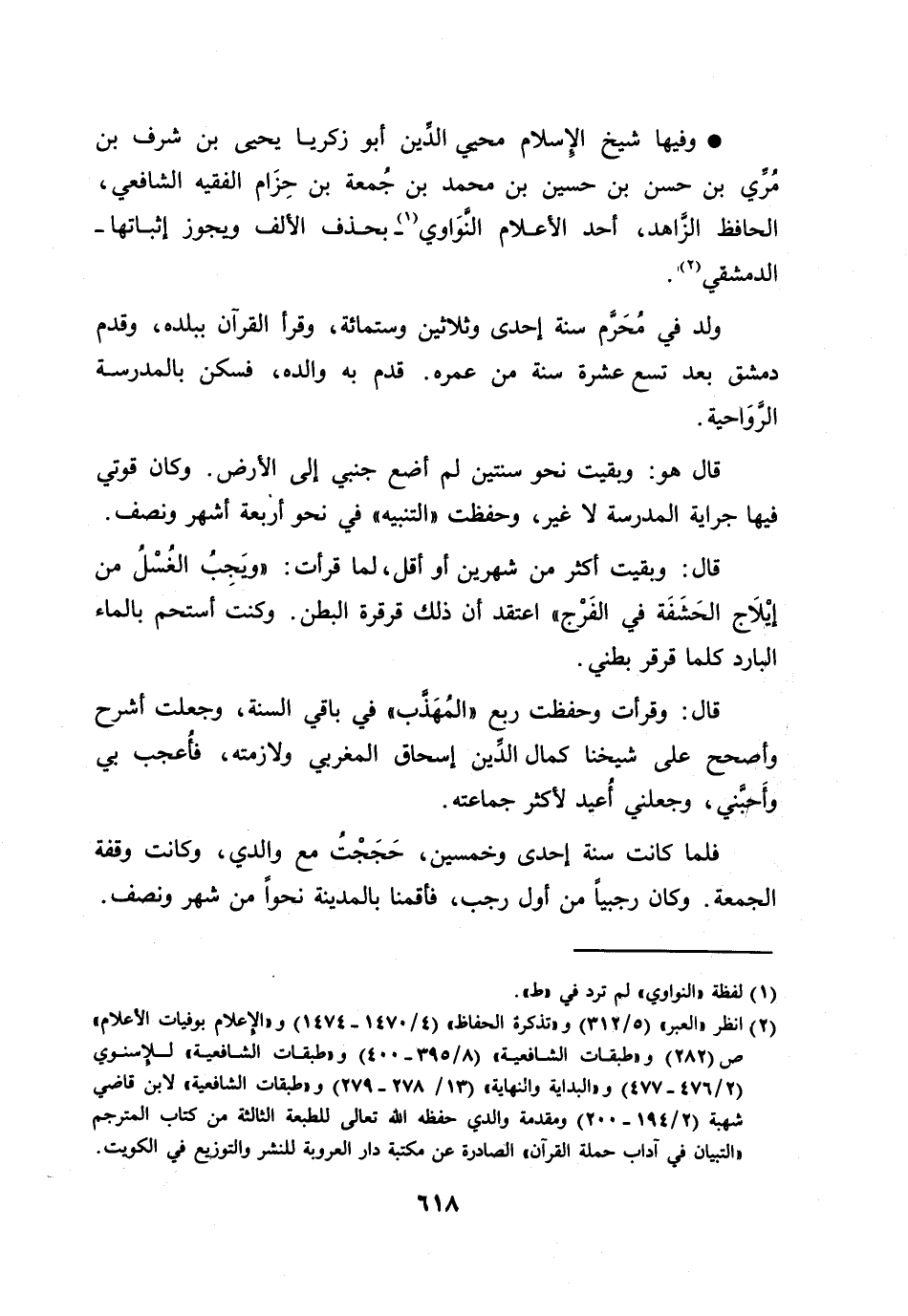 [2] انظر «العبر» (5/ 312) و «تذكرة الحفاظ» (4/ 1470- 1474) و «الإعلام بوفيات الأعلام» ص (282) و «طبقات الشافعية» (8/ 395- 400) و «طبقات الشافعية» للإسنوي (2/ 476- 477) و «البداية والنهاية» (13/ 278- 279) و «طبقات الشافعية» لابن قاضي شهبة (2/ 194- 200) ومقدمة والدي حفظه الله تعالى للطبعة الثالثة من كتاب المترجم «التبيان في آداب حملة القرآن» الصادرة عن مكتبة دار العروبة للنشر والتوزيع في الكويت.