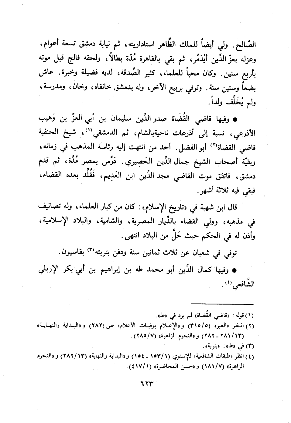 وفيها قاضي القضاة صدر الدّين سليمان بن أبي العزّ بن وهيب الأذرعي، نسبة إلى أذرعات ناحية بالشام، ثم الدمشقي [1] ، شيخ الحنفية قاضي القضاة [2] أبو الفضل. أحد من انتهت إليه رئاسة المذهب في زمانه، وبقيّة أصحاب الشيخ جمال الدّين الحصيري. درّس بمصر مدّة، ثم قدم دمشق، فاتفق موت القاضي مجد الدّين ابن العديم، فقلّد بعده القضاء، فبقي فيه ثلاثة أشهر.