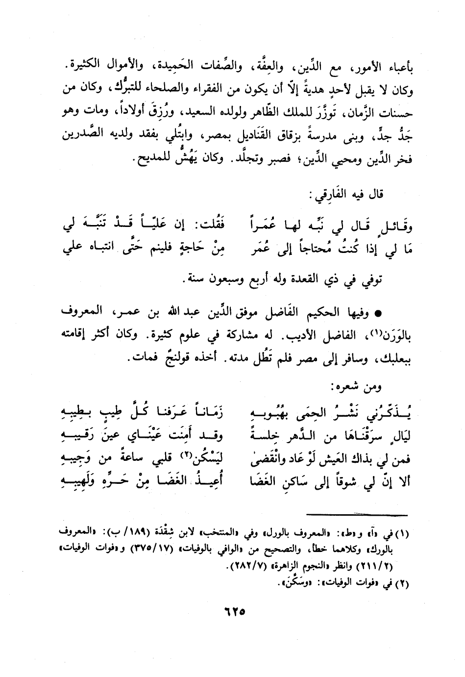 وفيها الحكيم الفاضل موفق الدّين عبد الله بن عمر، المعروف بالورن [1] ، الفاضل الأديب. له مشاركة في علوم كثيرة. وكان أكثر إقامته ببعلبك، وسافر إلى مصر فلم تطل مدته. أخذه قولنج فمات.