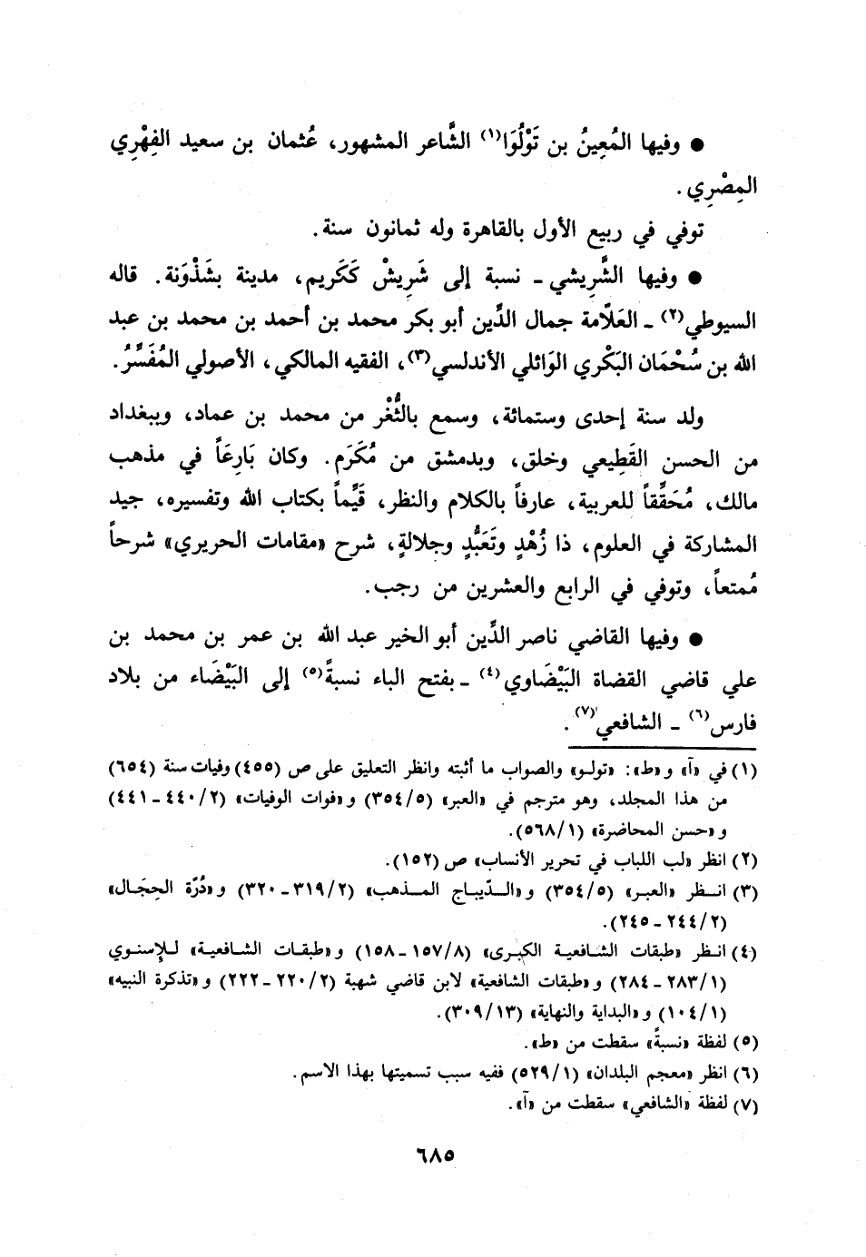 وفيها القاضي ناصر الدّين أبو الخير عبد الله بن عمر بن محمد بن علي قاضي القضاة البيضاوي [4]- بفتح الباء نسبة [5] إلى البيضاء من بلاد فارس [6]- الشافعي [7] .