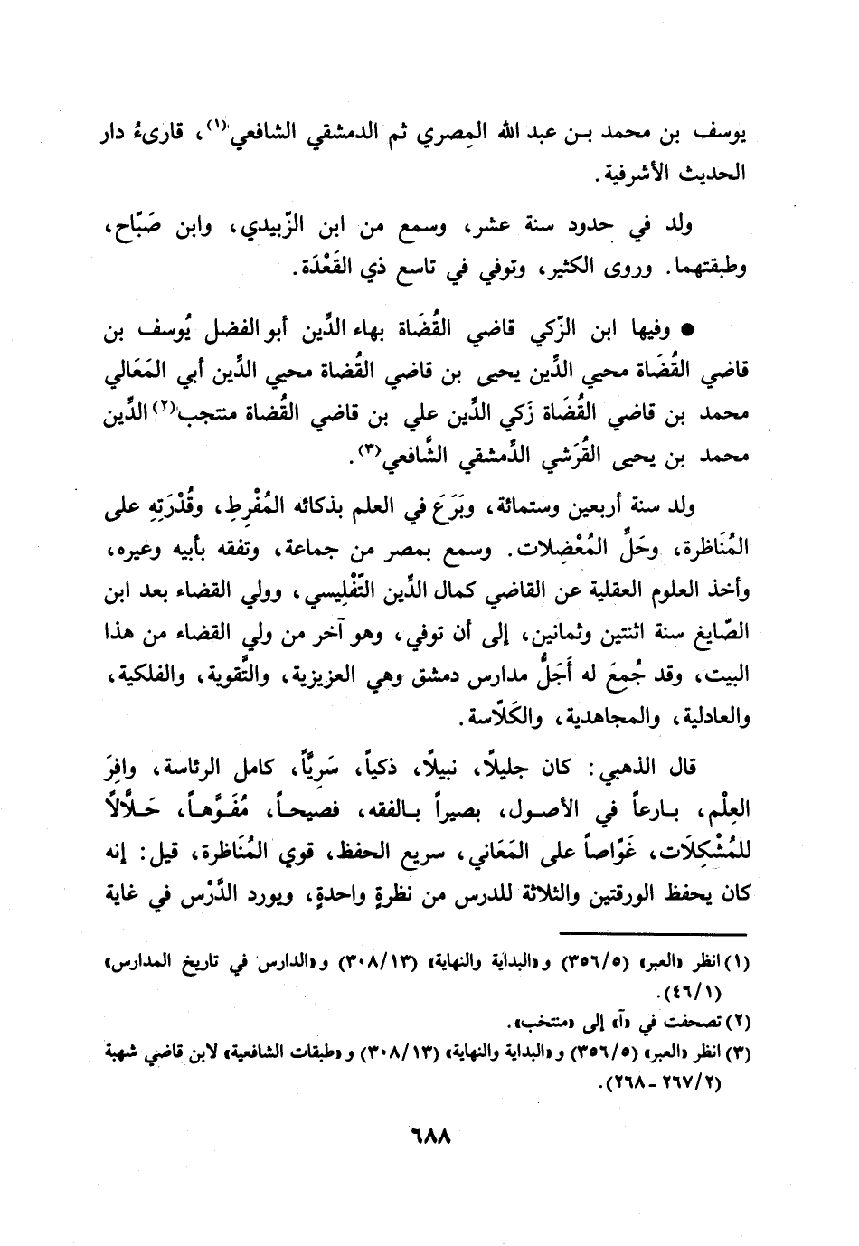 وفيها ابن الزّكي قاضي القضاة بهاء الدّين أبو الفضل يوسف بن قاضي القضاة محيي الدّين يحيى بن قاضي القضاة محيي الدّين أبي المعالي محمد بن قاضي القضاة زكي الدّين علي بن قاضي القضاة منتجب [2] الدّين محمد بن يحيى القرشي الدّمشقي الشّافعي [3] .