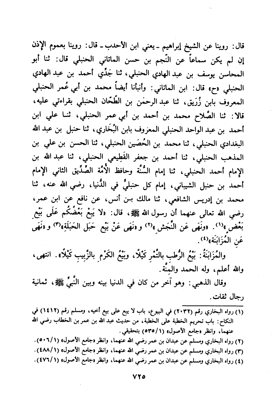 قال: روينا عن الشيخ إبراهيم- يعني ابن الأحدب- قال: روينا بعموم الإذن إن لم يكن سماعا عن النّجم بن حسن الماتاني الحنبلي قال: ثنا أبو المحاسن يوسف بن عبد الهادي الحنبلي، ثنا جدّي أحمد بن عبد الهادي الحنبلي «ح» قال: ابن الماتاني: وأنبأنا أيضا محمد بن أبي عمر الحنبلي المعروف بابن زريق، ثنا عبد الرحمن بن الطّحّان الحنبلي بقراءتي عليه، قالا: ثنا الصّلاح محمد بن أحمد بن أبي عمر الحنبلي، ثنا علي ابن أحمد بن عبد الواحد الحنبلي المعروف بابن البخاري، ثنا حنبل بن عبد الله البغدادي الحنبلي، ثنا محمد بن الحصين الحنبلي، ثنا الحسن بن علي بن المذهب الحنبلي، ثنا أحمد بن جعفر القطيعي الحنبلي، ثنا عبد الله بن الإمام أحمد الحنبلي، ثنا إمام السّنّة وحافظ الأمّة الصّدّيق الثاني الإمام أحمد بن حنبل الشيباني، إمام كل حنبليّ في الدّنيا، رضي الله عنه، ثنا محمد بن إدريس الشافعي، ثنا مالك بن أنس، عن نافع عن ابن عمر، رضي الله تعالى عنهما أن رسول الله صلى الله عليه وسلم، قال: «لا يبع بعضكم على بيع بعض» [1] . «ونهى عن النّجش» [2] و «نهى عن بيع حبل الحبلة» [3] و «نهى عن المزابنة» [4] . والمزابنة: بيع الرّطب بالتّمر كيلا، وبيع الكرم بالزّبيب كيلا» . انتهى، والله أعلم، وله الحمد والمنّة.