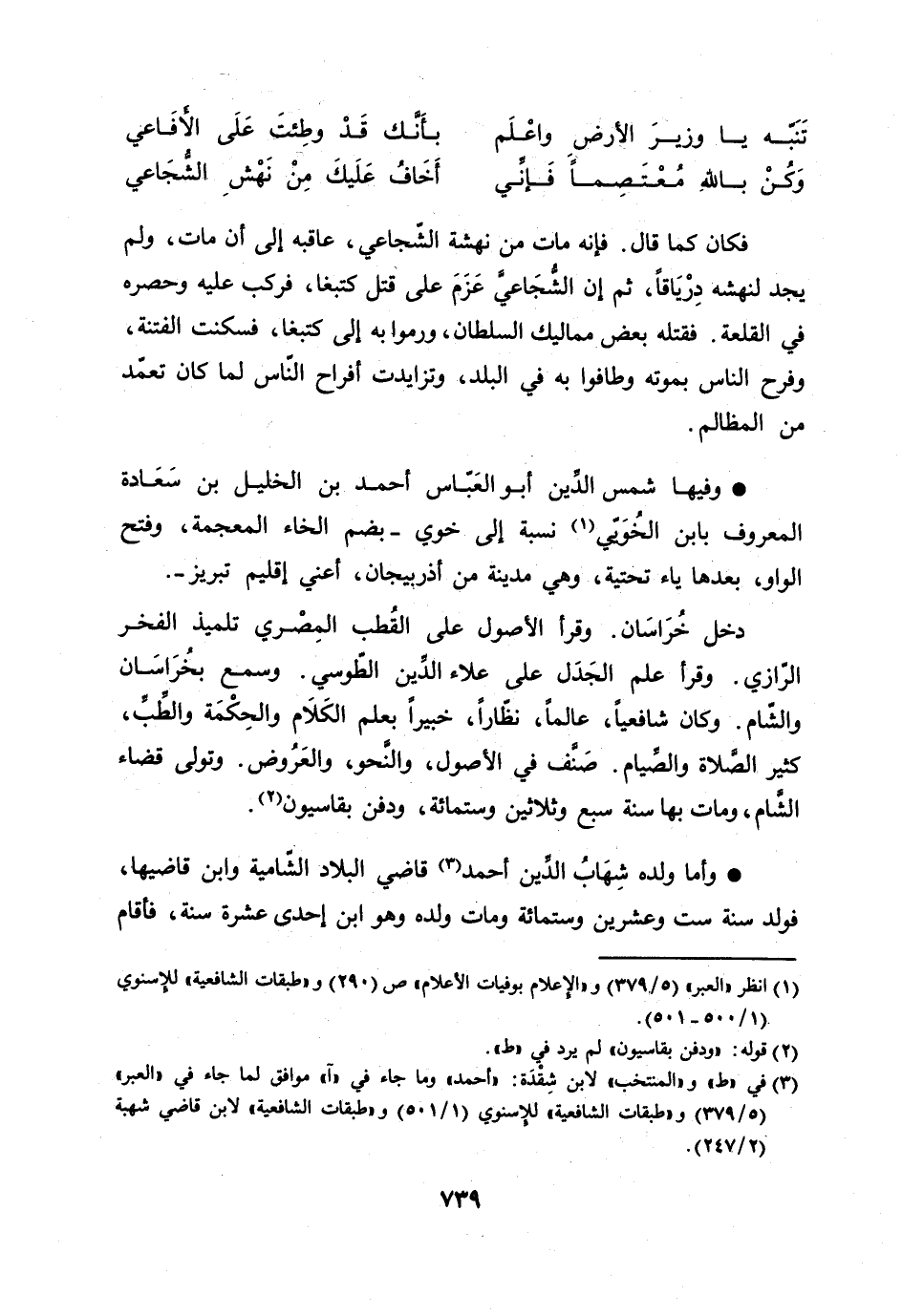 وفيها شمس الدّين أبو العبّاس أحمد بن الخليل بن سعادة المعروف بابن الخويي [1] نسبة إلى خوي- بضم الخاء المعجمة، وفتح الواو، بعدها ياء تحتية، وهي مدينة من أذربيجان، أعني إقليم تبريز-.