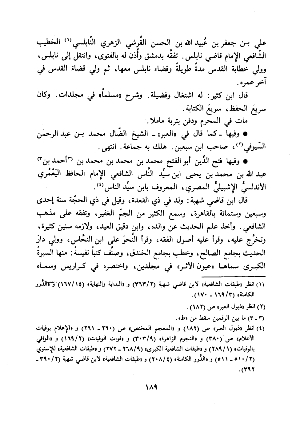 [4] انظر «ذيول العبر» ص (182) و «المعجم المختص» ص (260- 261) و «الإعلام بوفيات الأعلام» ص (380) و «النجوم الزاهرة» (9/ 303) و «فوات الوفيات» (2/ 169) و «الوافي بالوفيات» (1/ 289) و «طبقات الشافعية الكبرى» (9/ 268- 272) و «طبقات الشافعية» للإسنوي (2/ 510- 511) و «الدّرر الكامنة» (4/ 208) و «طبقات الشافعية» لابن قاضي شهبة (2/ 390- 392) .