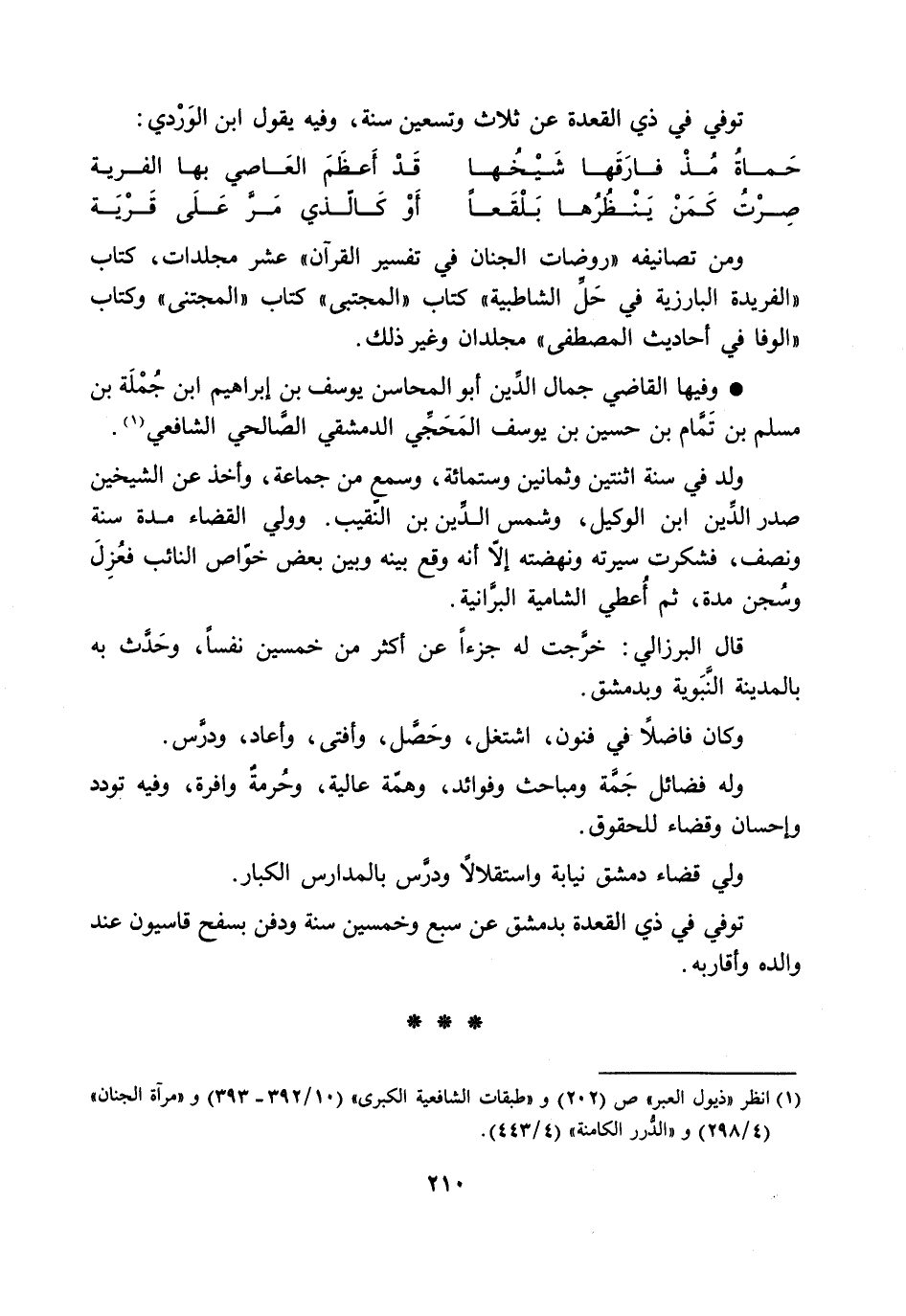 وفيها القاضي جمال الدّين أبو المحاسن يوسف بن إبراهيم ابن جملة بن مسلم بن تمّام بن حسين بن يوسف المحجّي الدمشقي الصّالحي الشافعي [1] .