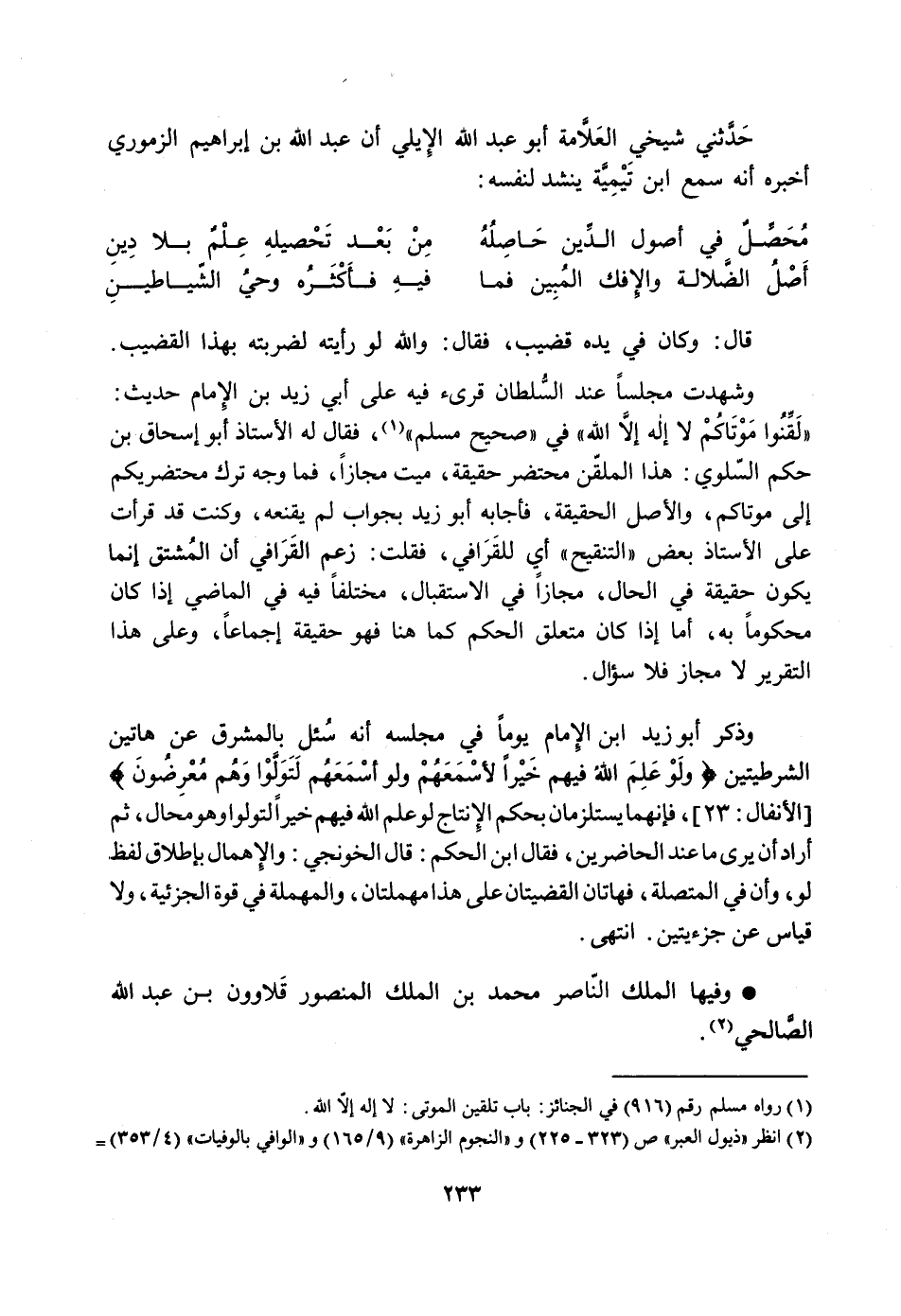 «لقّنوا موتاكم لا إله إلّا الله» في «صحيح مسلم» [1] ، فقال له الأستاذ أبو إسحاق بن حكم السّلوي: هذا الملقّن محتضر حقيقة، ميت مجازا، فما وجه ترك محتضريكم إلى موتاكم، والأصل الحقيقة، فأجابه أبو زيد بجواب لم يقنعه، وكنت قد قرأت على الأستاذ بعض «التنقيح» أي للقرافي، فقلت: زعم القرافي أن المشتق إنما يكون حقيقة في الحال، مجازا في الاستقبال، مختلفا فيه في الماضي إذا كان محكوما به، أما إذا كان متعلق الحكم كما هنا فهو حقيقة إجماعا، وعلى هذا التقرير لا مجاز فلا سؤال.