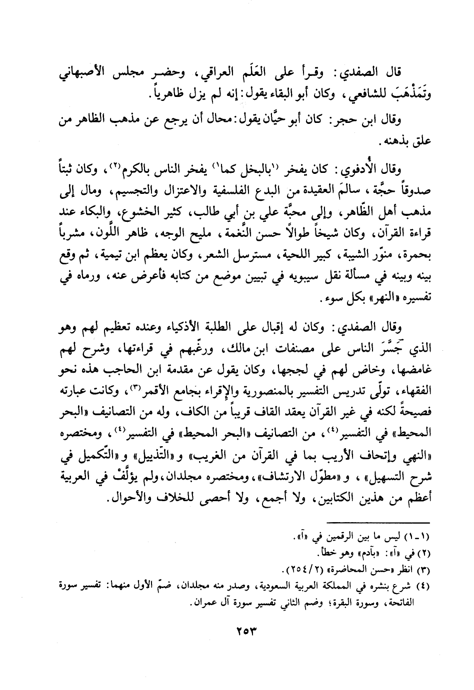 وقال الصفدي: وكان له إقبال على الطلبة الأذكياء وعنده تعظيم لهم وهو الذي جسّر الناس على مصنفات ابن مالك، ورغّبهم في قراءتها، وشرح لهم غامضها، وخاض لهم في لججها، وكان يقول عن مقدمة ابن الحاجب هذه نحو الفقهاء، تولّى تدريس التفسير بالمنصورية والإقراء بجامع الأقمر [3] ، وكانت عبارته فصيحة لكنه في غير القرآن يعقد القاف قريبا من الكاف، وله من التصانيف «البحر المحيط» في التفسير [، من التصانيف «البحر المحيط» في التفسير] [4] ، ومختصره «النهي وإتحاف الأريب بما في القرآن من الغريب» و «التذييل» و «التّكميل في شرح التسهيل» ، و «مطوّل الارتشاف» ، ومختصره مجلدان، ولم يؤلّف في العربية أعظم من هذين الكتابين، ولا أجمع، ولا أحصى للخلاف والأحوال.