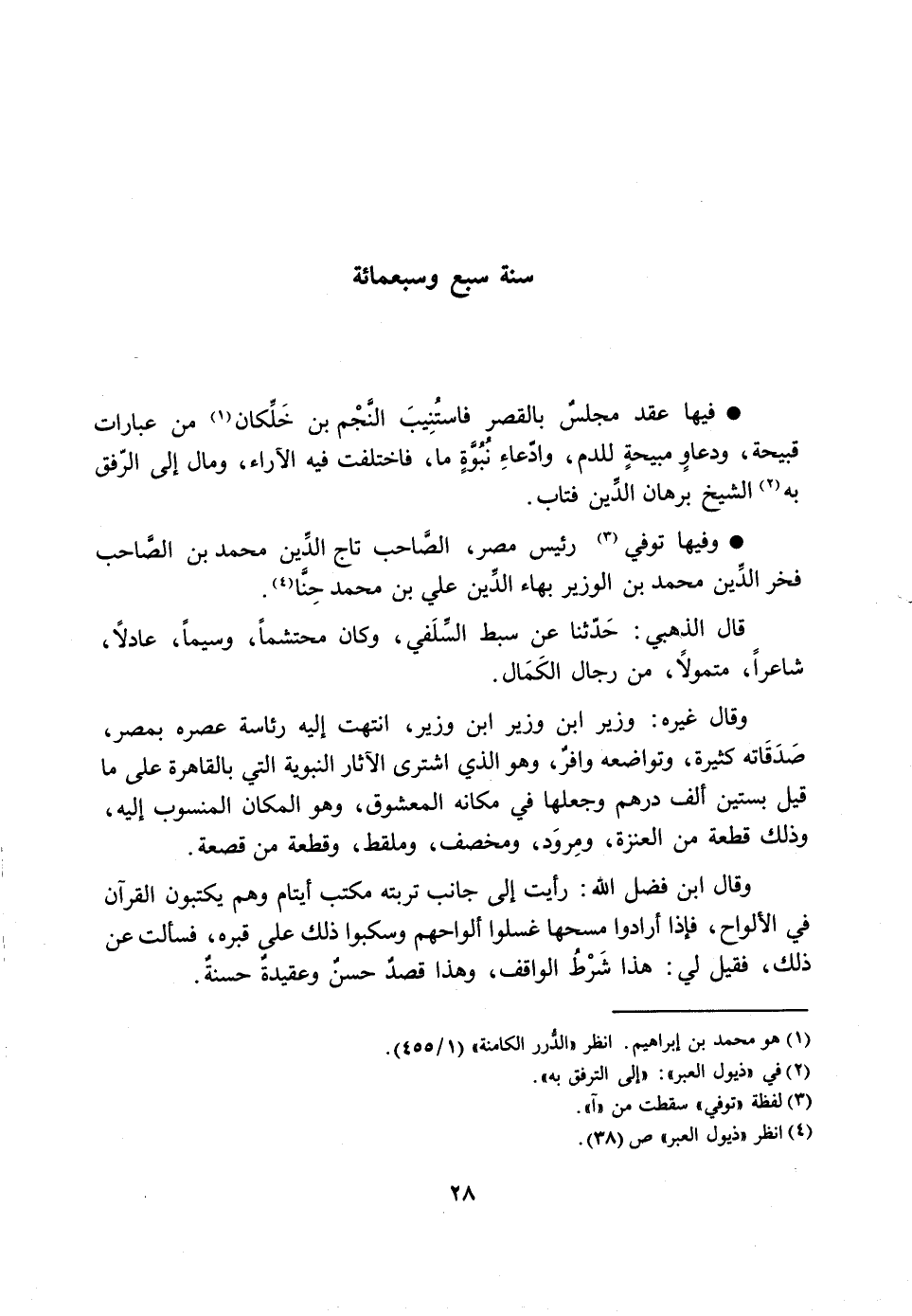 فيها عقد مجلس بالقصر فاستنيب النّجم بن خلّكان [1] من عبارات قبيحة، ودعاو مبيحة للدم، وادّعاء نبوّة ما، فاختلفت فيه الآراء، ومال إلى الرّفق به [2] الشيخ برهان الدّين فتاب.