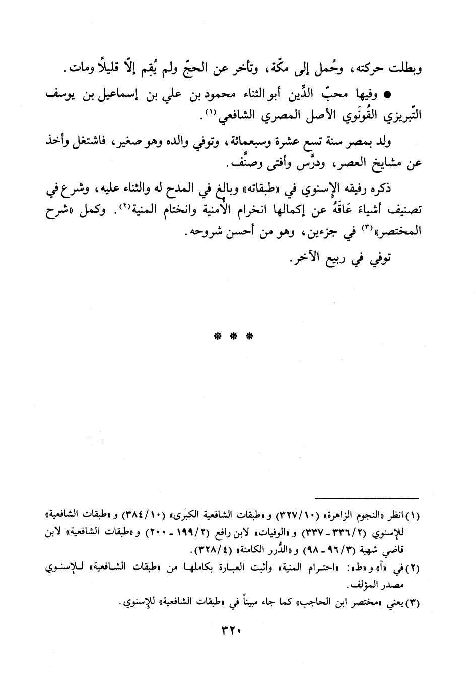 [2] في «آ» و «ط» : «احترام المنية» وأثبت العبارة بكاملها من «طبقات الشافعية» للإسنوي مصدر المؤلف.