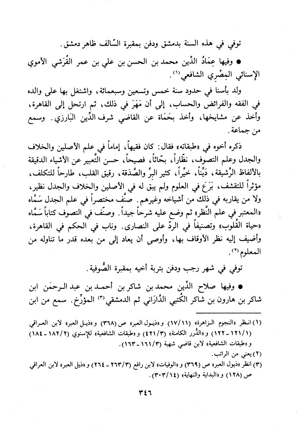 [3] انظر «ذيول العبر» ص (369) و «الوفيات» لابن رافع (3/ 263- 264) و «ذيل العبر» لابن العراقي ص (128) و «البداية والنهاية» (14/ 303) .