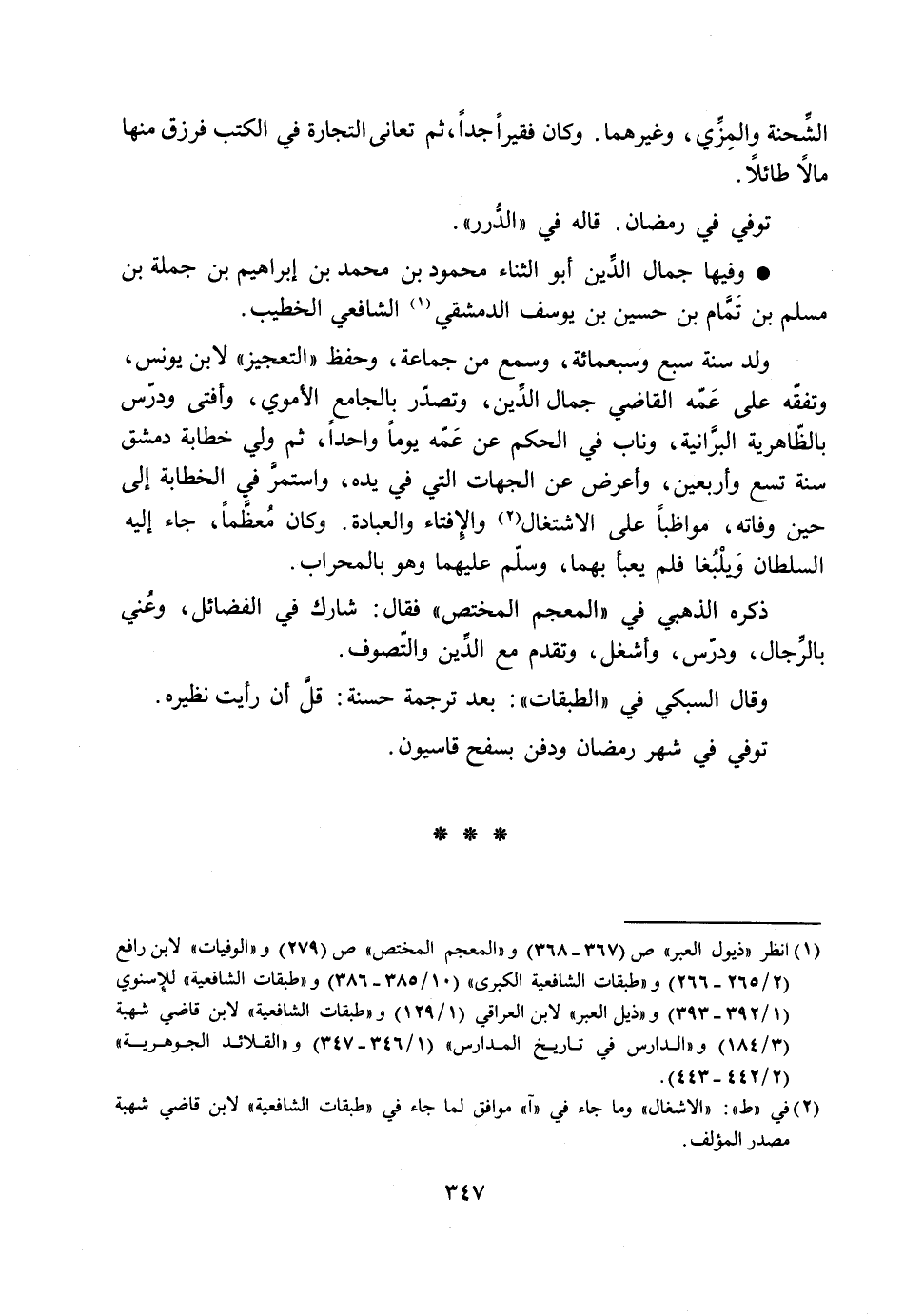 [1] انظر «ذيول العبر» ص (367- 368) و «المعجم المختص» ص (279) و «الوفيات» لابن رافع (2/ 265- 266) و «طبقات الشافعية الكبرى» (10/ 385- 386) و «طبقات الشافعية» للإسنوي (1/ 392- 393) و «ذيل العبر» لابن العراقي (1/ 129) و «طبقات الشافعية» لابن قاضي شهبة (3/ 184) و «الدارس في تاريخ المدارس» (1/ 346- 347) و «القلائد الجوهرية» (2/ 442- 443) .