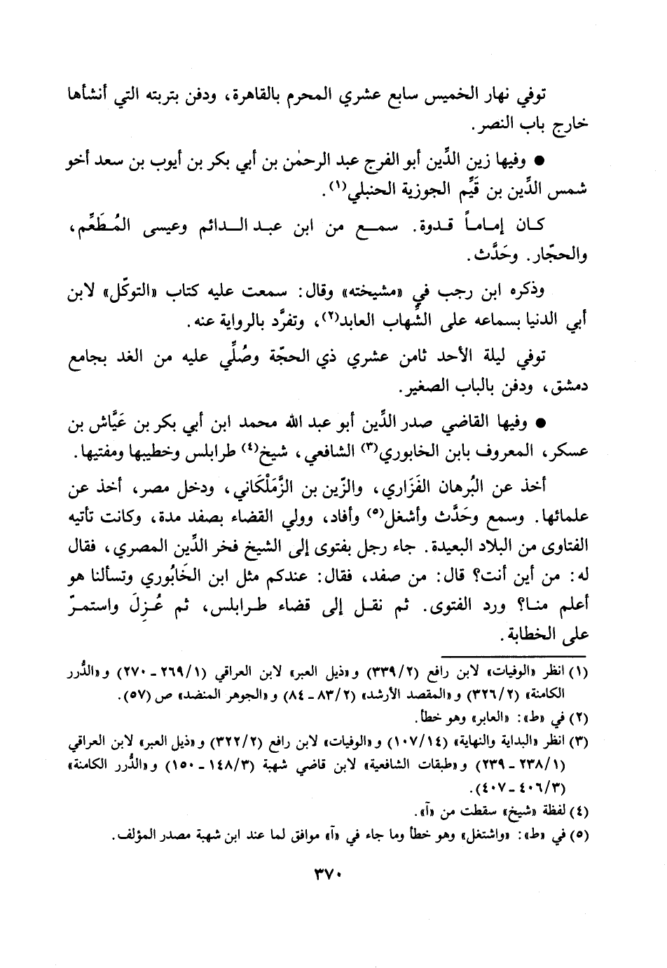 وفيها زين الدّين أبو الفرج عبد الرحمن بن أبي بكر بن أيوب بن سعد أخو شمس الدّين بن قيّم الجوزية الحنبلي [1] .