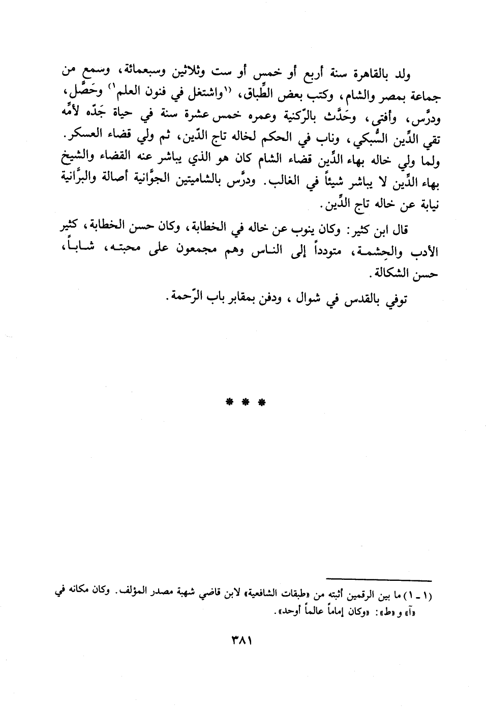 [1] ما بين القوسين أثبته من «طبقات الشافعية» لابن قاضي شهبة مصدر المؤلف. وكان مكانه في «آ» و «ط» : «وكان إماما عالما أوحد» .