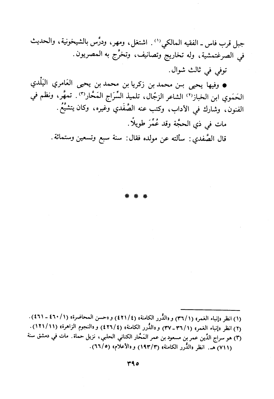 وفيها يحيى بن محمد بن زكريا بن محمد بن يحيى العامري اليلدي الحموي ابن الخباز [2] الشاعر الزجّال، تلميذ السّراج المحّار [3] . تمهّر، ونظم في الفنون، وشارك في الآداب، وكتب عنه الصّفدي وغيره، وكان يتشيّع.