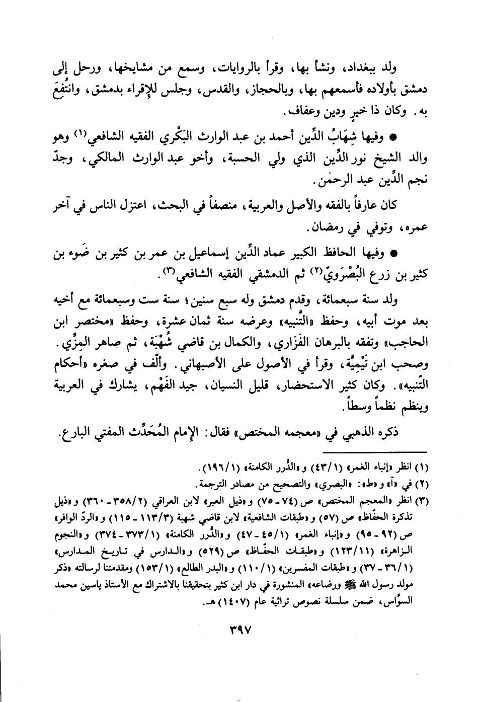 [3] انظر «المعجم المختص» ص (74- 75) و «ذيل العبر» لابن العراقي (2/ 358- 360) و «ذيل تذكرة الحفّاظ» ص (57) و «طبقات الشافعية» لابن قاضي شهبة (3/ 113- 115) و «الردّ الوافر» ص (92- 95) و «إنباء الغمر» (1/ 45- 47) و «الدّرر الكامنة» (1/ 373- 374) و «النجوم الزاهرة» (11/ 123) و «طبقات الحفّاظ» ص (529) و «الدارس في تاريخ المدارس» (1/ 36- 37) و «طبقات المفسرين» (1/ 110) و «البدر الطالع» (1/ 153) ومقدمتنا لرسالته «ذكر مولد رسول الله صلّى الله عليه وسلّم ورضاعه» المنشورة في دار ابن كثير بتحقيقنا بالاشتراك مع الأستاذ ياسين محمد السوّاس، ضمن سلسلة نصوص تراثية عام (1407) هـ.