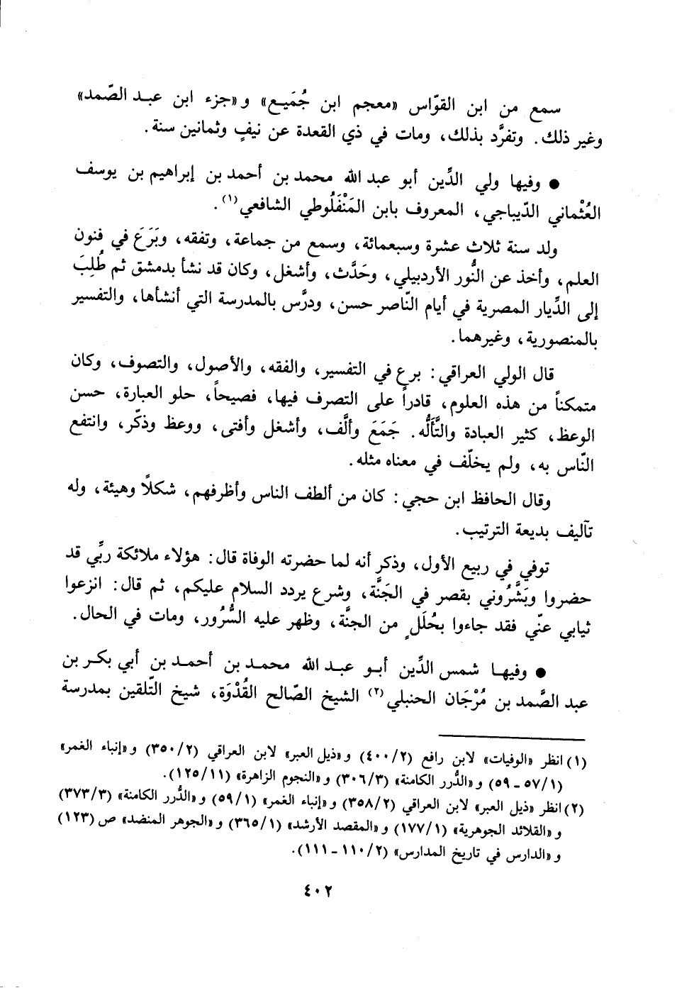 [2] انظر «ذيل العبر» لابن العراقي (2/ 358) و «إنباء الغمر» (1/ 59) و «الدّرر الكامنة» (3/ 373) و «القلائد الجوهرية» (1/ 177) و «المقصد الأرشد» (1/ 365) و «الجوهر المنضد» ص (123) و «الدارس في تاريخ المدارس» (2/ 110- 111) .