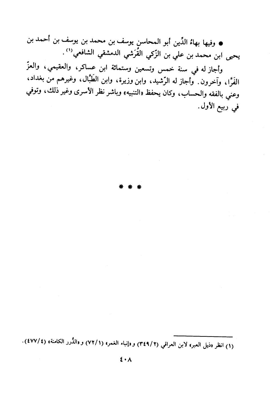 وفيها بهاء الدّين أبو المحاسن يوسف بن محمد بن يوسف بن أحمد بن يحيى ابن محمد بن علي بن الزّكي القرشي الدمشقي الشافعي [1] .