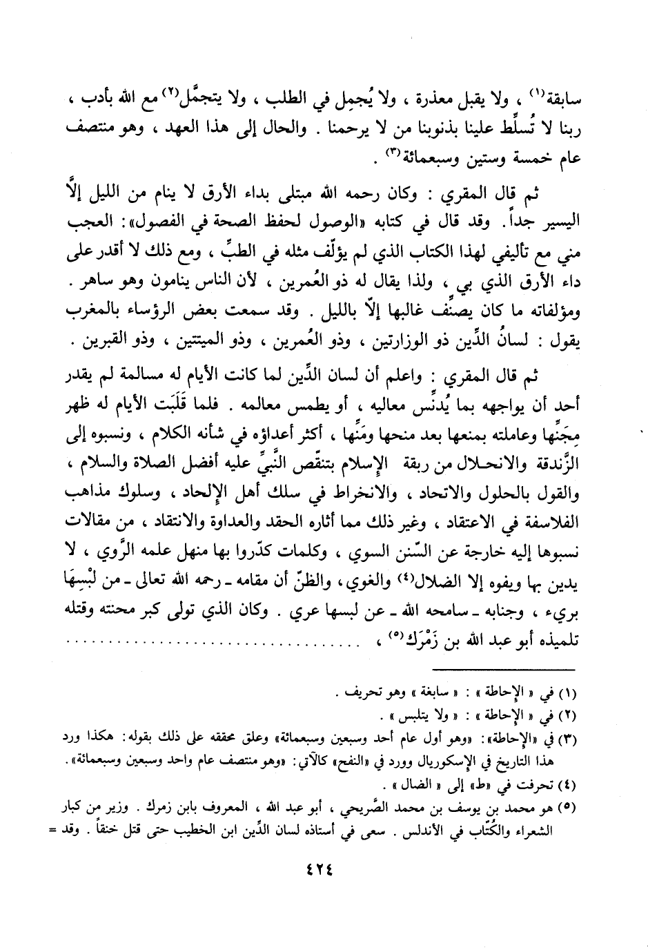 ثم قال المقري: واعلم أن لسان الدّين لما كانت الأيام له مسالمة لم يقدر أحد أن يواجهه بما يدنّس معاليه، أو يطمس معالمه. فلما قلبت الأيام له ظهر مجنّها وعاملته بمنعها بعد منحها ومنّها، أكثر أعداؤه في شأنه الكلام، ونسبوه إلى الزّندقة والانحلال من ربقة الإسلام بتنقّص النّبيّ عليه أفضل الصلاة والسلام، والقول بالحلول والاتحاد، والانخراط في سلك أهل الإلحاد، وسلوك مذاهب الفلاسفة في الاعتقاد، وغير ذلك مما أثاره الحقد والعداوة والانتقاد، من مقالات نسبوها إليه خارجة عن السّنن السوي، وكلمات كدّروا بها منهل علمه الرّوي، لا يدين بها ويفوه إلا الضلال [4] والغوي، والظنّ أن مقامه- رحمه الله تعالى- من لبسها بريء، وجنابه- سامحه الله- عن لبسها عري. وكان الذي تولى كبر محنته وقتله تلميذه أبو عبد الله بن زمرك [5] ،................