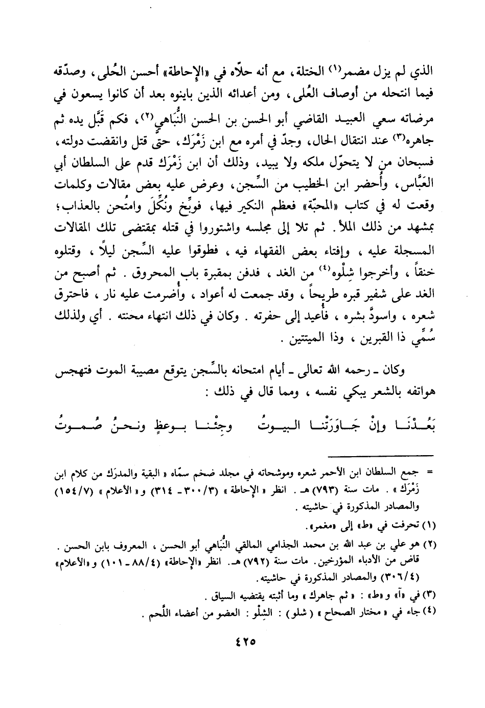 الذي لم يزل مضمر [1] الختلة، مع أنه حلّاه في «الإحاطة» أحسن الحلي، وصدّقه فيما انتحله من أوصاف العلى، ومن أعدائه الذين باينوه بعد أن كانوا يسعون في مرضاته سعي العبيد القاضي أبو الحسن بن الحسن النّباهي [2] ، فكم قبّل يده ثم جاهره [3] عند انتقال الحال، وجدّ في أمره مع ابن زمرك، حتّى قتل وانقضت دولته، فسبحان من لا يتحوّل ملكه ولا يبيد، وذلك أن ابن زمرك قدم على السلطان أبي العبّاس، وأحضر ابن الخطيب من السّجن، وعرض عليه بعض مقالات وكلمات وقعت له في كتاب «المحبّة» فعظم النكير فيها، فوبّخ ونكّل وامتحن بالعذاب، بمشهد من ذلك الملأ. ثم تلا إلى مجلسه واشتوروا في قتله بمقتضى تلك المقالات المسجلة عليه، وإفتاء بعض الفقهاء فيه، فطوقوا عليه السّجن ليلا، وقتلوه خنقا، وأخرجوا شلوه [4] من الغد، فدفن بمقبرة باب المحروق. ثم أصبح من الغد على شفير قبره طريحا، وقد جمعت له أعواد، وأضرمت عليه نار، فاحترق شعره، واسودّ بشره، فأعيد إلى حفرته. وكان في ذلك انتهاء محنته. أي ولذلك سمّي ذا القبرين، وذا الميتتين.