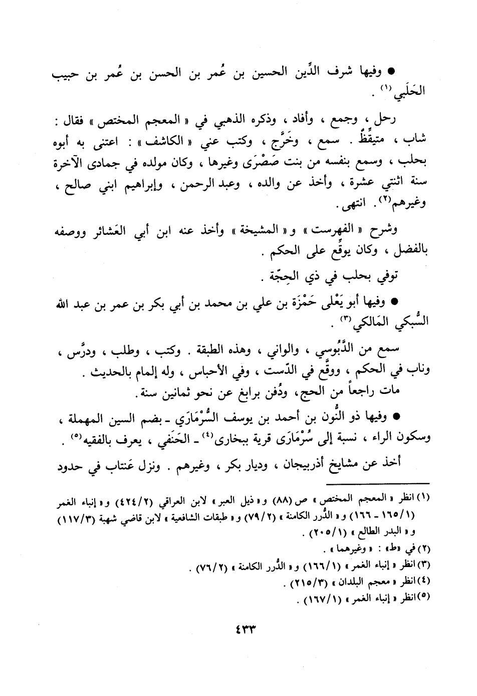 وفيها شرف الدّين الحسين بن عمر بن الحسن بن عمر بن حبيب الحلبي [1] .
