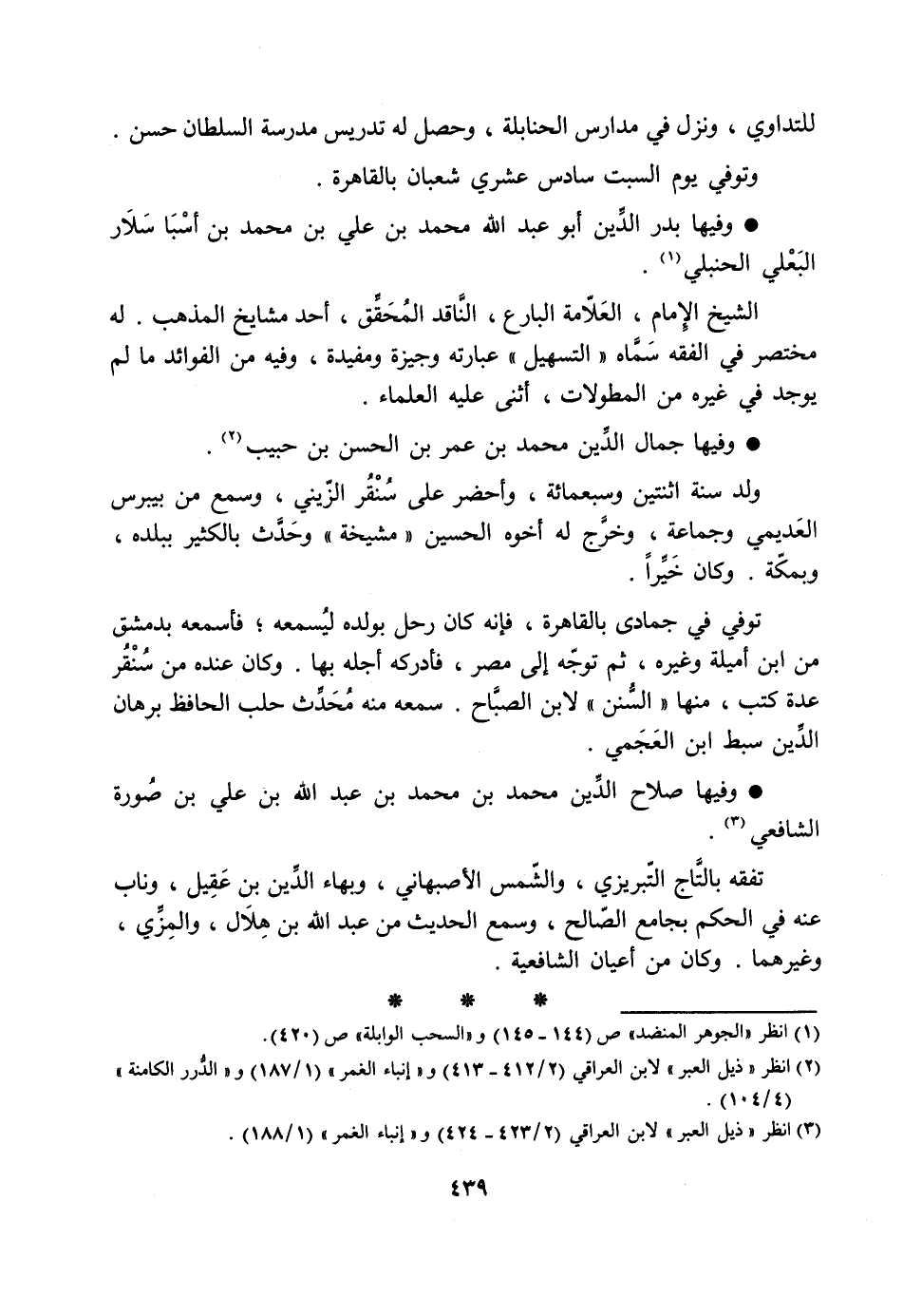 وفيها بدر الدّين أبو عبد الله محمد بن علي بن محمد بن أسباسلار البعلي الحنبلي [1] .