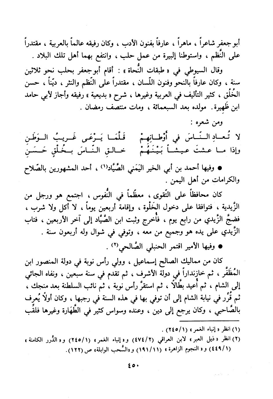 وقال السيوطي في «طبقات النّحاة» : أقام أبو جعفر بحلب نحو ثلاثين سنة، وكان عارفا بالنحو وفنون اللّسان، مقتدرا على النّظم والنثر، ديّنا، حسن الخلق، كثير التأليف في العربية وغيرها، شرح «بديعية» رفيقه وأجاز لأبي حامد ابن ظهيرة. مولده بعد السبعمائة، ومات منتصف رمضان.