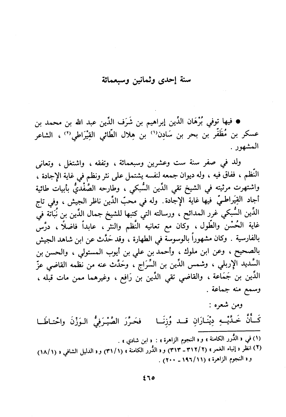فيها توفي برهان الدّين إبراهيم بن شرف الدّين عبد الله بن محمد بن عسكر بن مظفّر بن بحر بن سادن [1] بن هلال الطّائي القيراطي [2] ، الشاعر المشهور.