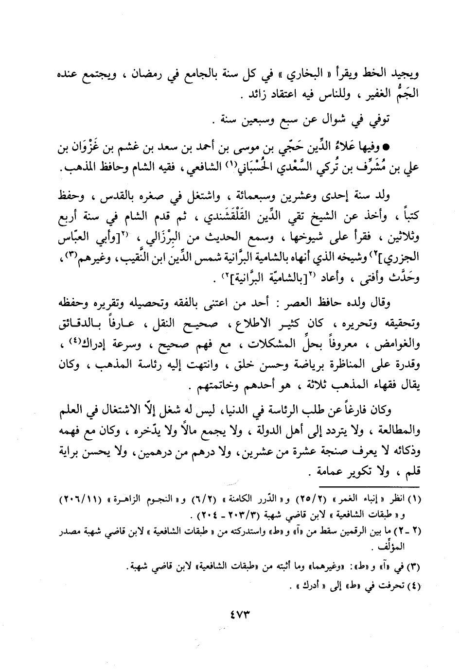 [1] انظر «إنباء الغمر» (2/ 25) و «الدّرر الكامنة» (2/ 6) و «النجوم الزاهرة» (11/ 206) و «طبقات الشافعية» لابن قاضي شهبة (3/ 203- 204) .