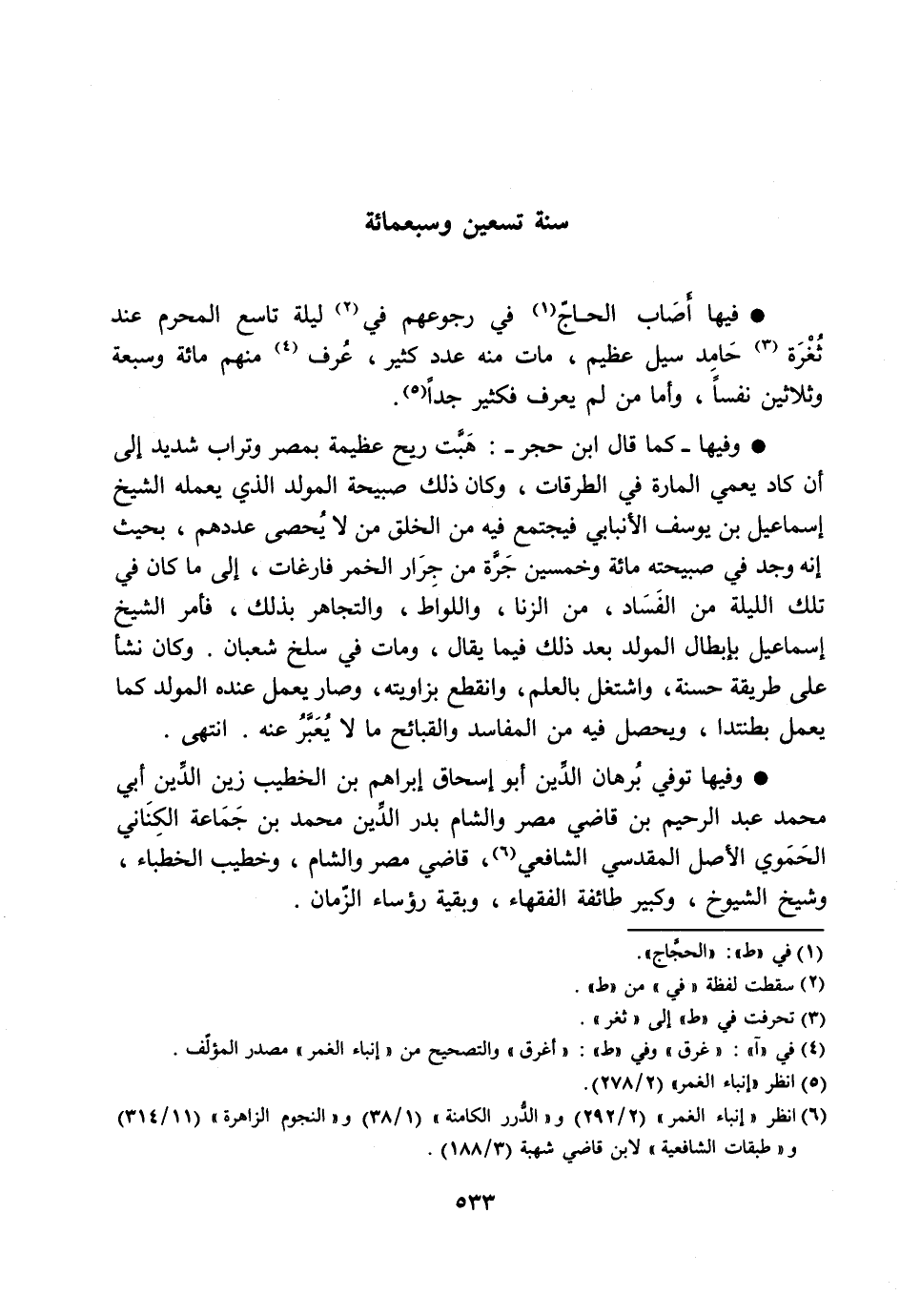 [6] انظر «إنباء الغمر» (2/ 292) و «الدّرر الكامنة» (1/ 38) و «النجوم الزاهرة» (11/ 314) و «طبقات الشافعية» لابن قاضي شهبة (3/ 188) .