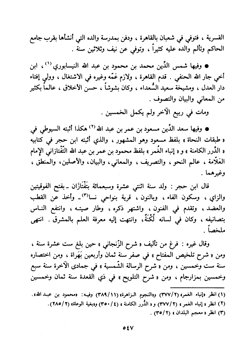 وفيها سعد الدّين مسعود بن عمر بن عبد الله [2] هكذا أثبته السيوطي في «طبقات النحاة» بلفظ مسعود وهو المشهور، والذي أثبته ابن حجر في كتابيه «الدّرر الكامنة» و «إنباء الغمر» بلفظ محمود بن عمر بن عبد الله التّفتازاني الإمام العلّامة، عالم النحو، والتصريف، والمعاني، والبيان، والأصلين، والمنطق، وغيرهما.