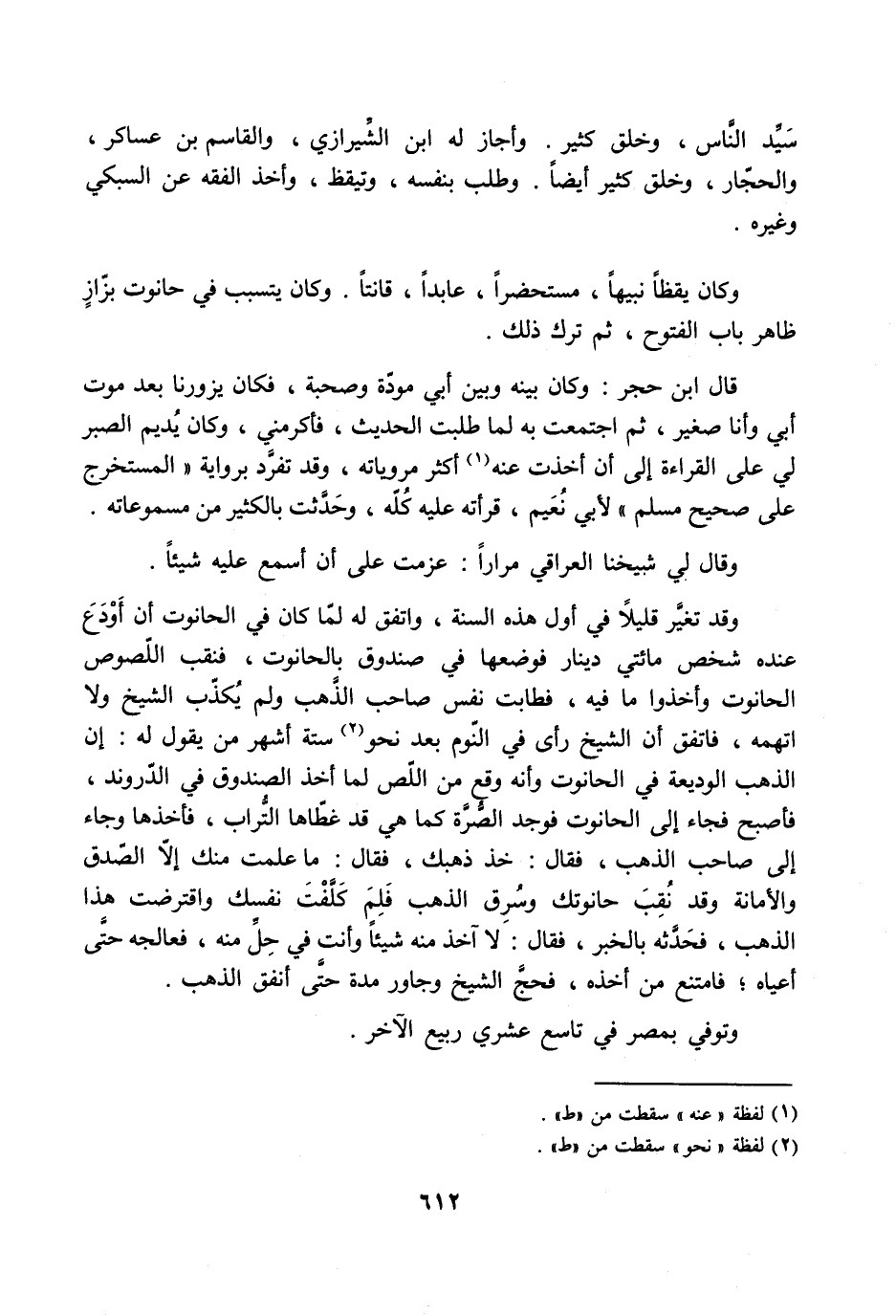 وقد تغيّر قليلا في أول هذه السنة، واتفق له لمّا كان في الحانوت أن أودع عنده شخص مائتي دينار فوضعها في صندوق بالحانوت، فنقب اللّصوص الحانوت وأخذوا ما فيه، فطابت نفس صاحب الذّهب ولم يكذّب الشيخ ولا اتهمه، فاتفق أن الشيخ رأى في النّوم بعد نحو [2] ستة أشهر من يقول له: إن الذهب الوديعة في الحانوت وأنه وقع من اللّص لما أخذ الصندوق في الدّروند، فأصبح فجاء إلى الحانوت فوجد الصّرّة كما هي قد غطّاها التّراب، فأخذها وجاء إلى صاحب الذهب، فقال: خذ ذهبك، فقال: ما علمت منك إلّا الصّدق والأمانة وقد نقب حانوتك وسرق الذهب فلم كلّفت نفسك واقترضت هذا الذهب، فحدّثه بالخبر، فقال: لا آخذ منه شيئا وأنت في حلّ منه، فعالجه حتّى أعياه، فامتنع من أخذه، فحجّ الشيخ وجاور مدة حتّى أنفق الذهب.