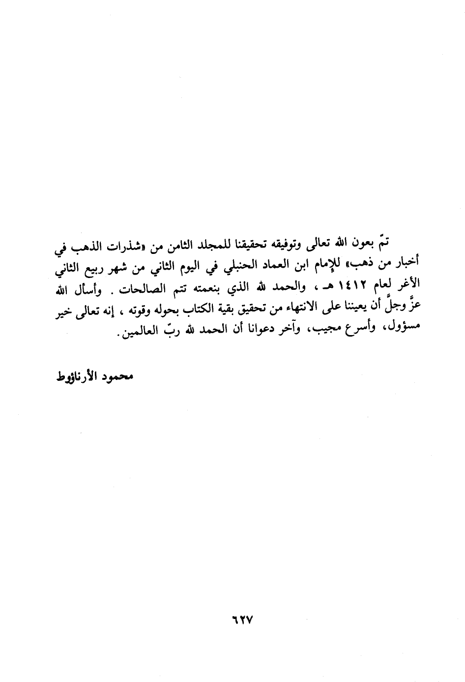 تمّ بعون الله تعالى وتوفيقه تحقيقنا للمجلد الثامن من «شذرات الذهب في أخبار من ذهب» للإمام ابن العماد الحنبلي في اليوم الثاني من شهر ربيع الثاني الأغر لعام 1412 هـ، والحمد لله الذي بنعمته تتم الصالحات. وأسأل الله عزّ وجلّ أن يعيننا على الانتهاء من تحقيق بقية الكتاب بحوله وقوته، إنه تعالى خير مسؤول، وأسرع مجيب، وآخر دعوانا أن الحمد لله ربّ العالمين محمود الأرناؤوط