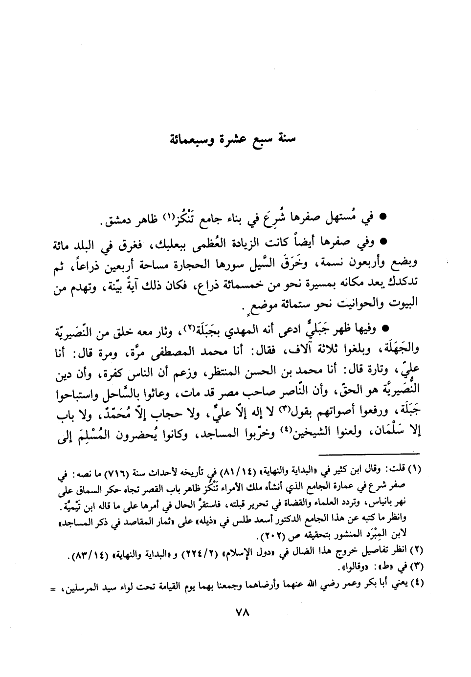 [1] قلت: وقال ابن كثير في «البداية والنهاية» (14/ 81) في تأريخه لأحداث سنة (716) ما نصه: في صفر شرع في عمارة الجامع الذي أنشأه ملك الأمراء تنكز ظاهر باب القصر تجاه حكر السماق على نهر بانياس، وتردد العلماء والقضاة في تحرير قبلته، فاستقرّ الحال في أمرها على ما قاله ابن تيميّة.