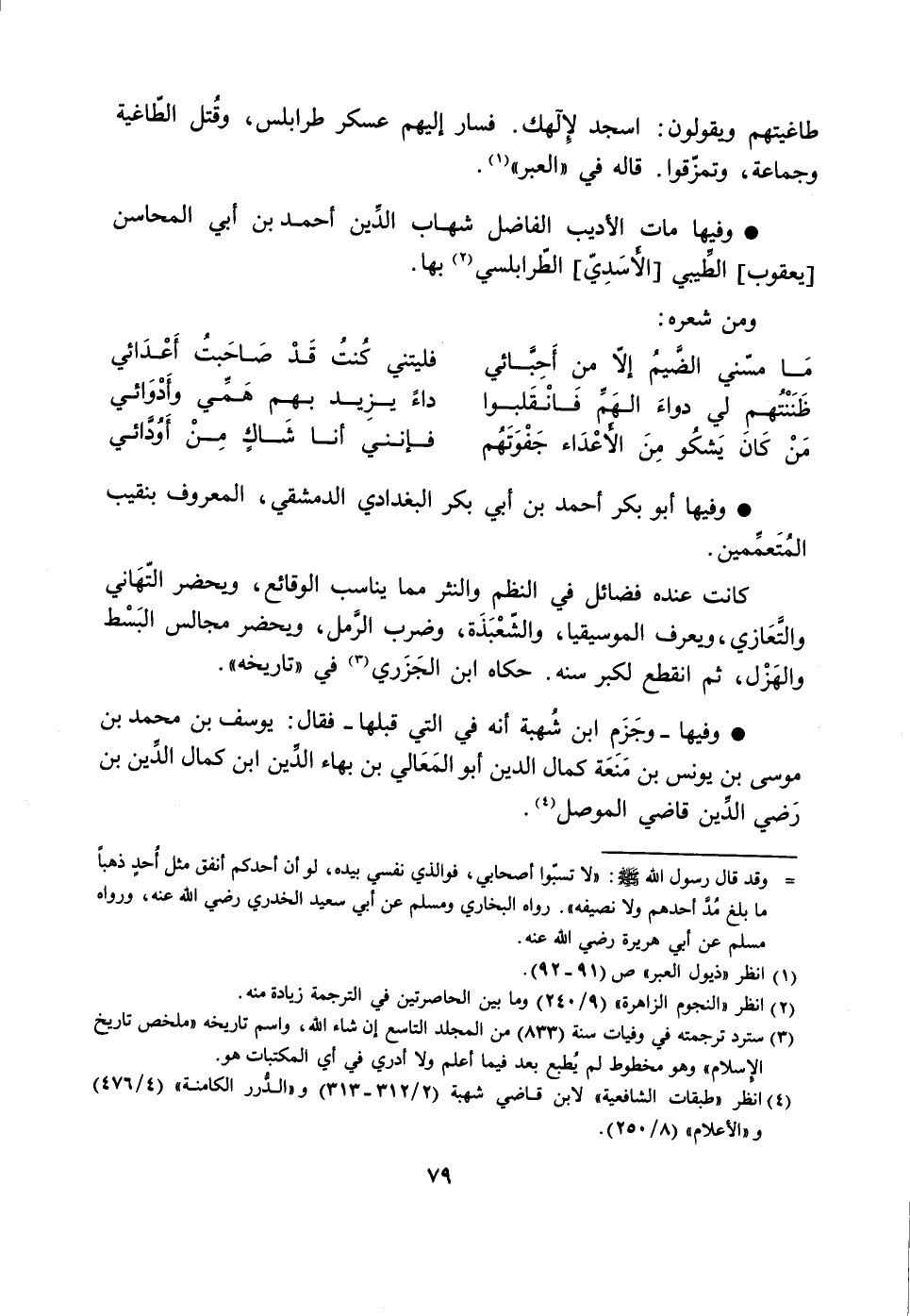 [3] سترد ترجمته في وفيات سنة (833) من المجلد التاسع إن شاء الله، واسم تاريخه «ملخص تاريخ الإسلام» وهو مخطوط لم يطبع بعد فيما أعلم ولا أدري في أي المكتبات هو.