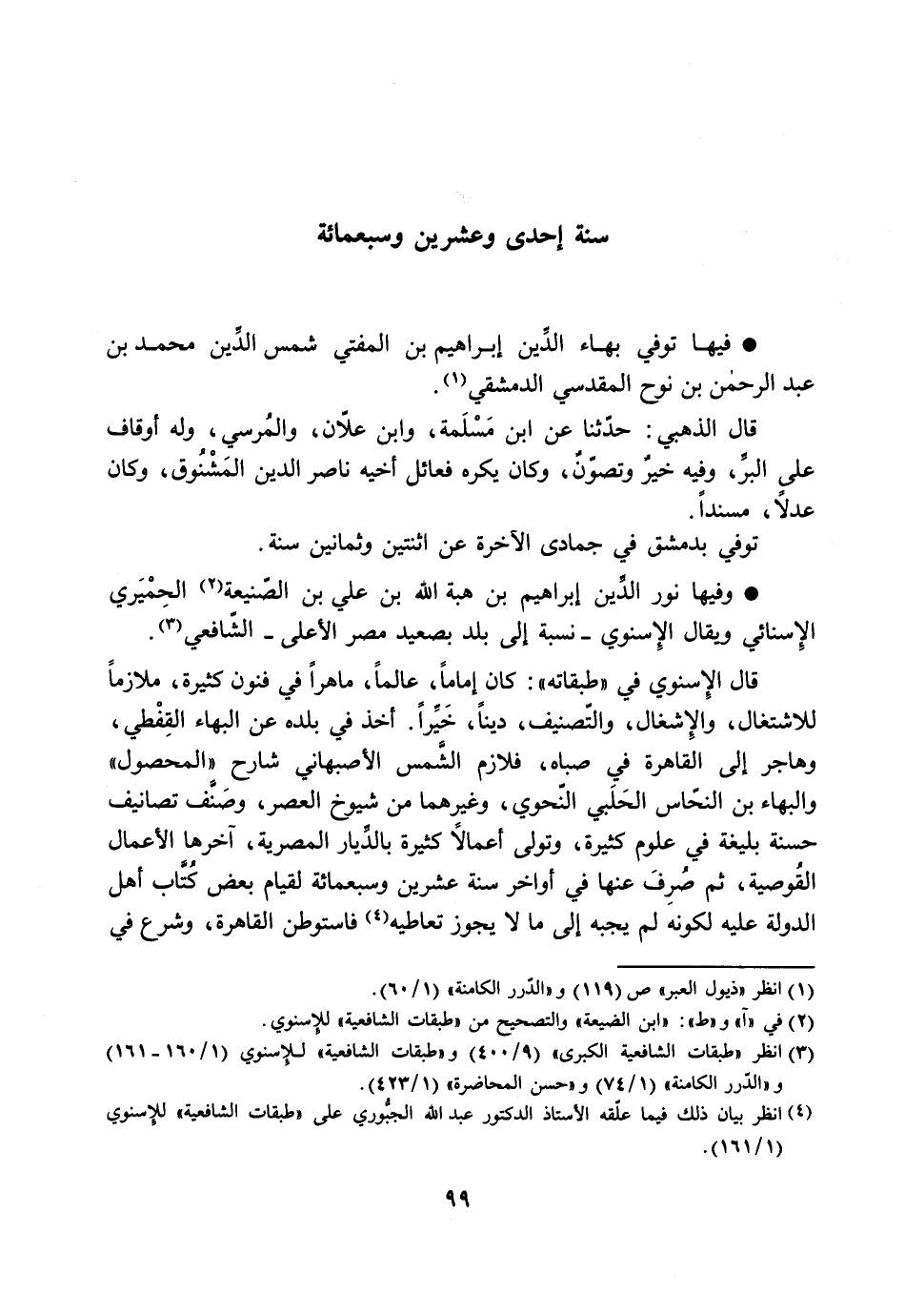وفيها نور الدّين إبراهيم بن هبة الله بن علي بن الصّنيعة [2] الحميري الإسنائي ويقال الإسنوي- نسبة إلى بلد بصعيد مصر الأعلى- الشّافعي [3] .