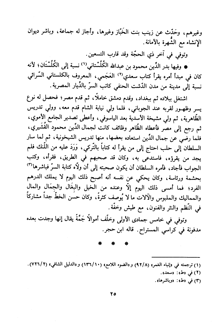 وفيها بدر الدّين محمود بن عبد الله الكلستاني [1] نسبة إلى الكلستان، لأنه كان في مبدأ أمره يقرأ كتاب سعدي [2] العجمي، المعروف بالكلستاني السّرائي نسبة إلى مدينة من مدن الدّشت الحنفي كاتب السرّ بالدّيار المصرية.