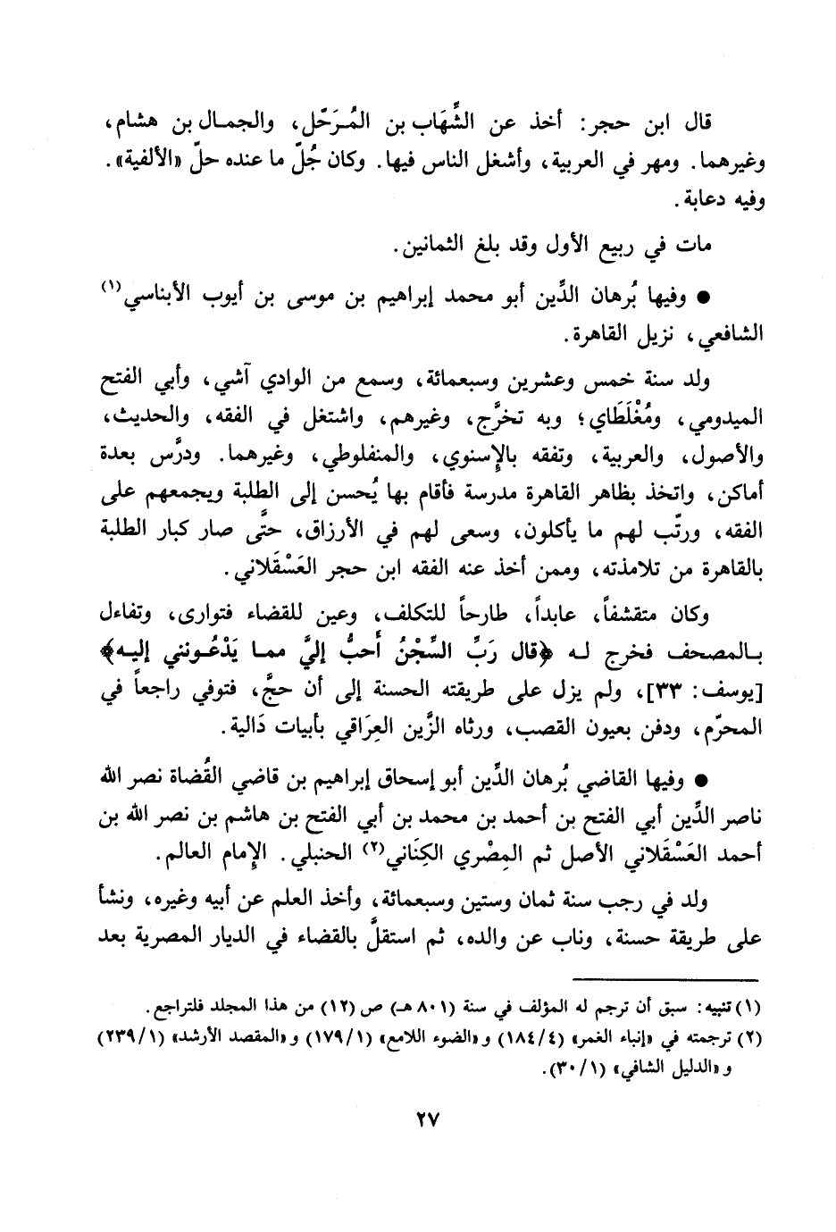 [2] ترجمته في «إنباء الغمر» (4/ 184) و «الضوء اللامع» (1/ 179) و «المقصد الأرشد» (1/ 239) و «الدليل الشافي» (1/ 30) .