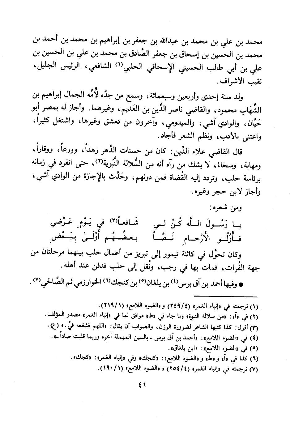 [2] في «آ» : «من سلالة النبوة» وما جاء في «ط» موافق لما في «إنباء الغمر» مصدر المؤلف.