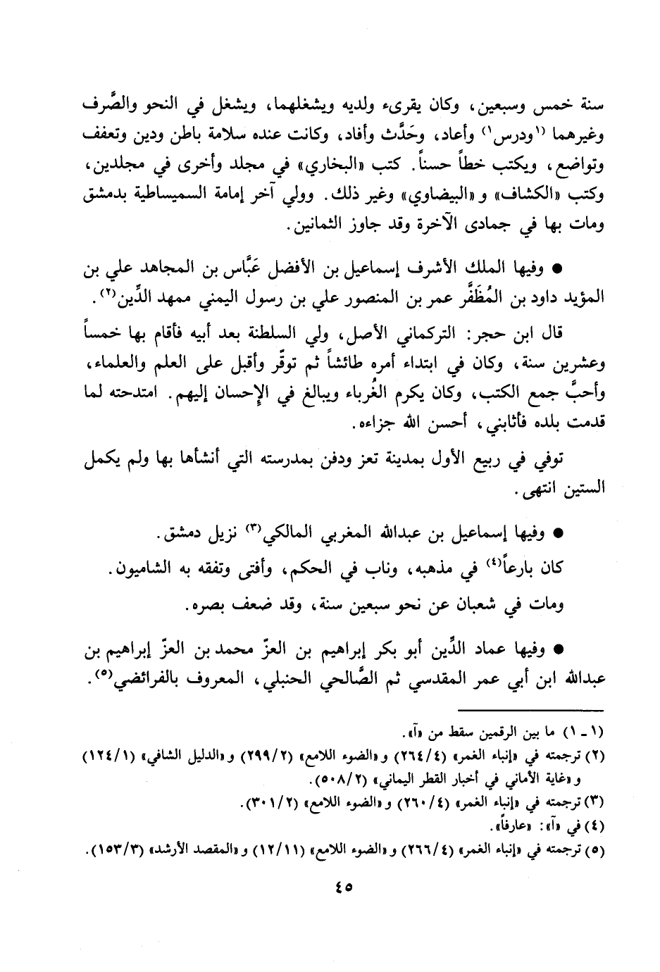 سنة خمس وسبعين، وكان يقرئ ولديه ويشغلهما، ويشغل في النحو والصّرف وغيرهما [1] ودرس [1] وأعاد، وحدّث وأفاد، وكانت عنده سلامة باطن ودين وتعفف وتواضع، ويكتب خطا حسنا. كتب «البخاري» في مجلد وأخرى في مجلدين، وكتب «الكشاف» و «البيضاوي» وغير ذلك. وولي آخر إمامة السميساطية بدمشق ومات بها في جمادى الآخرة وقد جاوز الثمانين.
