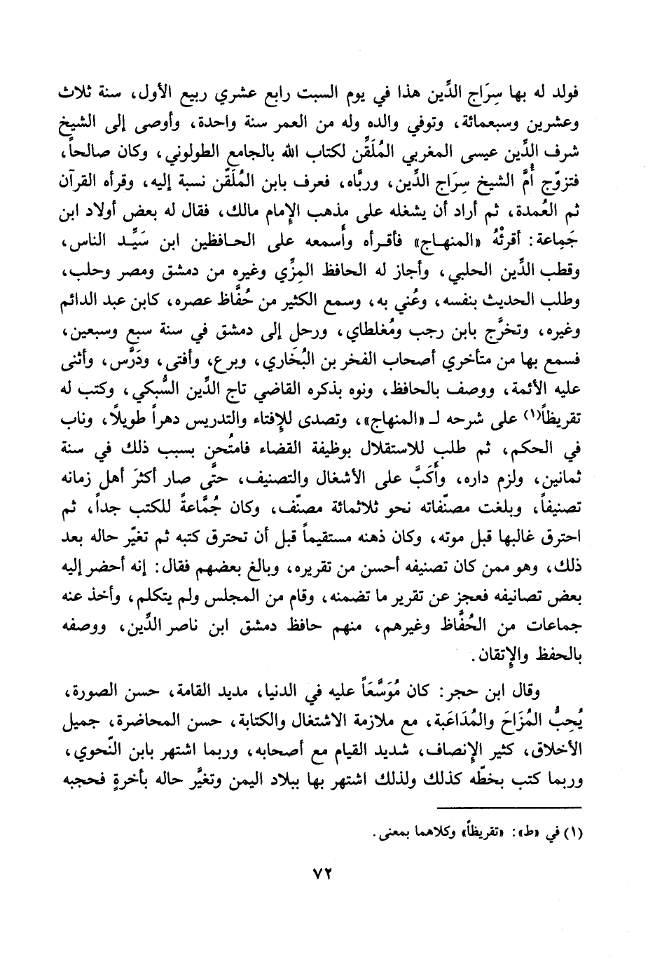 فولد له بها سراج الدّين هذا في يوم السبت رابع عشري ربيع الأول، سنة ثلاث وعشرين وسبعمائة، وتوفي والده وله من العمر سنة واحدة، وأوصى إلى الشيخ شرف الدّين عيسى المغربي الملقّن لكتاب الله بالجامع الطولوني، وكان صالحا، فتزوّج أمّ الشيخ سراج الدّين، وربّاه، فعرف بابن الملقّن نسبة إليه، وقرأه القرآن ثم العمدة، ثم أراد أن يشغله على مذهب الإمام مالك، فقال له بعض أولاد ابن جماعة: أقرئه «المنهاج» فأقرأه وأسمعه على الحافظين ابن سيّد الناس، وقطب الدّين الحلبي، وأجاز له الحافظ المزّي وغيره من دمشق ومصر وحلب، وطلب الحديث بنفسه، وعني به، وسمع الكثير من حفّاظ عصره، كابن عبد الدائم وغيره، وتخرّج بابن رجب ومغلطاي، ورحل إلى دمشق في سنة سبع وسبعين، فسمع بها من متأخري أصحاب الفخر بن البخاري، وبرع، وأفتى، ودرّس، وأثنى عليه الأئمة، ووصف بالحافظ، ونوه بذكره القاضي تاج الدّين السّبكي، وكتب له تقريظا [1] على شرحه ل «المنهاج» ، وتصدى للإفتاء والتدريس دهرا طويلا، وناب في الحكم، ثم طلب للاستقلال بوظيفة القضاء فامتحن بسبب ذلك في سنة ثمانين، ولزم داره، وأكبّ على الأشغال والتصنيف، حتّى صار أكثر أهل زمانه تصنيفا، وبلغت مصنّفاته نحو ثلاثمائة مصنّف، وكان جمّاعة للكتب جدا، ثم احترق غالبها قبل موته، وكان ذهنه مستقيما قبل أن تحترق كتبه ثم تغيّر حاله بعد ذلك، وهو ممن كان تصنيفه أحسن من تقريره، وبالغ بعضهم فقال: إنه أحضر إليه بعض تصانيفه فعجز عن تقرير ما تضمنه، وقام من المجلس ولم يتكلم، وأخذ عنه جماعات من الحفّاظ وغيرهم، منهم حافظ دمشق ابن ناصر الدّين، ووصفه بالحفظ والإتقان.