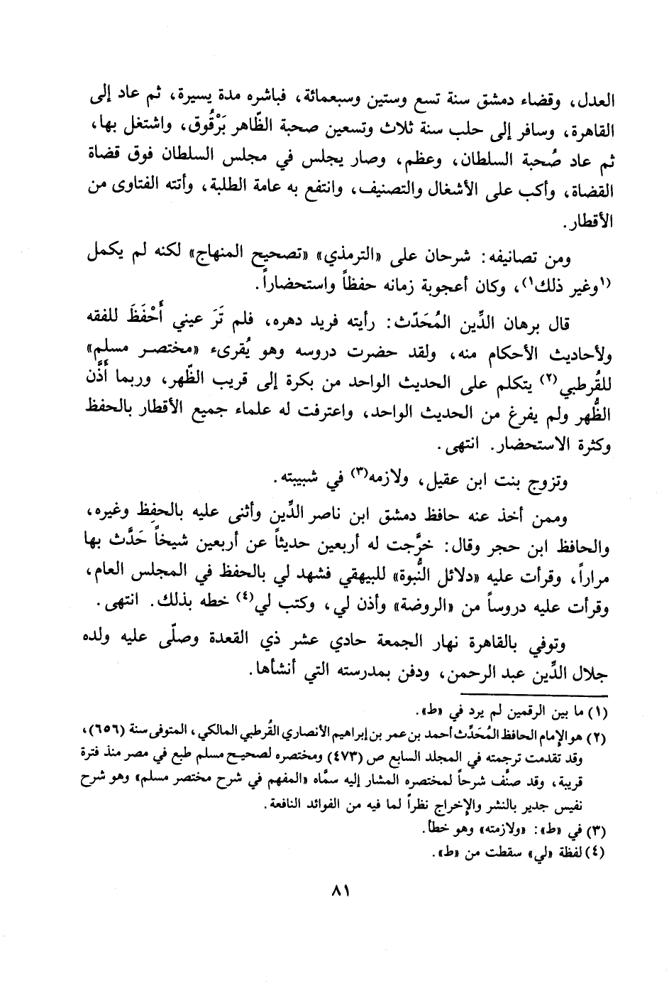 قال برهان الدّين المحدّث: رأيته فريد دهره، فلم تر عيني أحفظ للفقه ولأحاديث الأحكام منه، ولقد حضرت دروسه وهو يقرئ «مختصر مسلم» للقرطبي [2] يتكلم على الحديث الواحد من بكرة إلى قريب الظّهر، وربما أذّن الظّهر ولم يفرغ من الحديث الواحد، واعترفت له علماء جميع الأقطار بالحفظ وكثرة الاستحضار. انتهى.