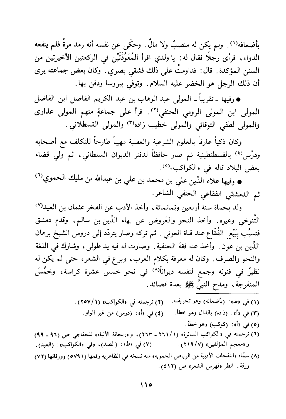 [6] ترجمته في «الكواكب السائرة» (1/ 261- 263) ، و «ريحانة الألباء» للخفاجي ص (96- 99) و «معجم المؤلفين» (7/ 219) .