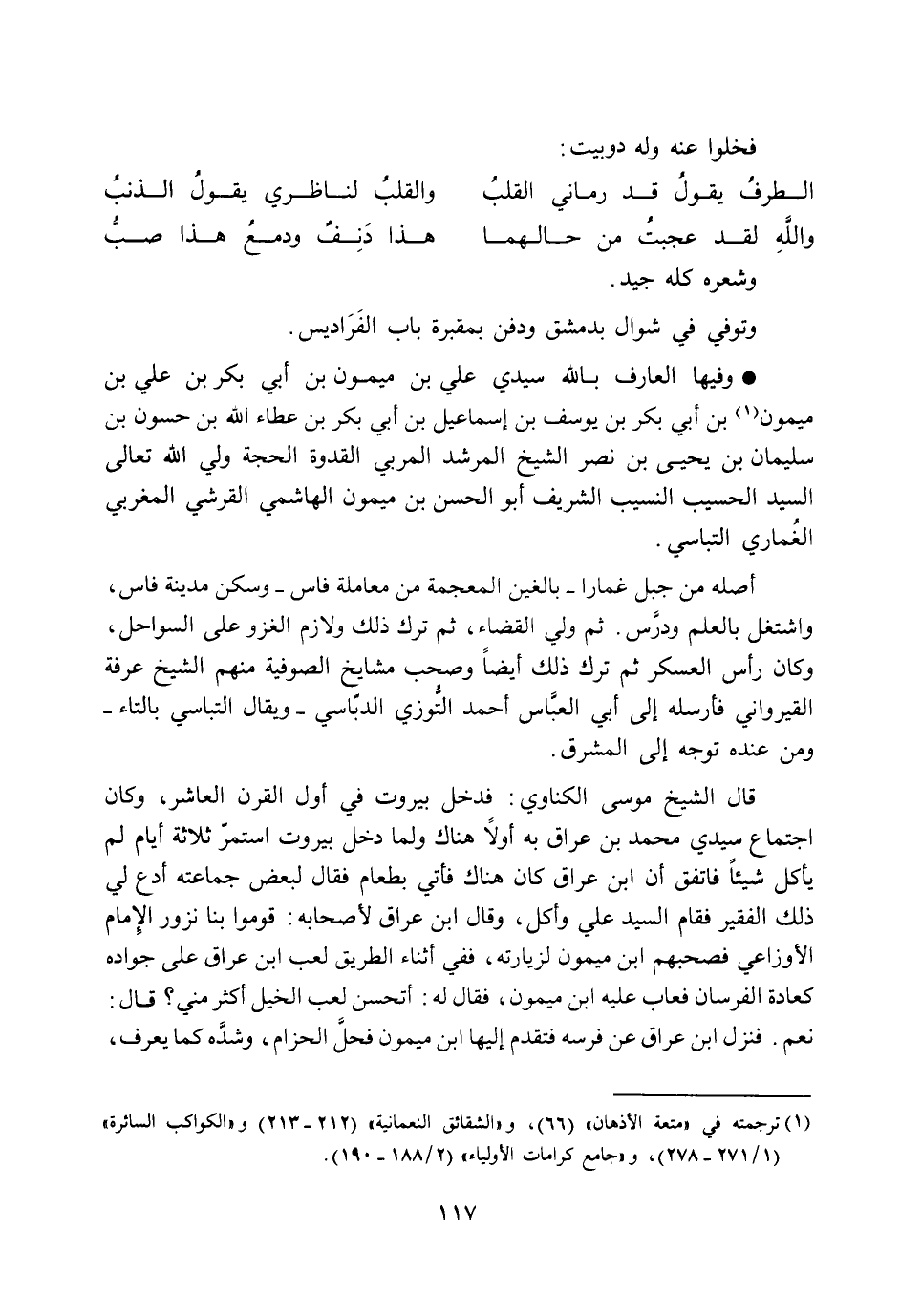 وفيها العارف بالله سيدي علي بن ميمون بن أبي بكر بن علي بن ميمون [1] بن أبي بكر بن يوسف بن إسماعيل بن أبي بكر بن عطاء الله بن حسون بن سليمان بن يحيى بن نصر الشيخ المرشد المربي القدوة الحجة ولي الله تعالى السيد الحسيب النسيب الشريف أبو الحسن بن ميمون الهاشمي القرشي المغربي الغماري التباسي.