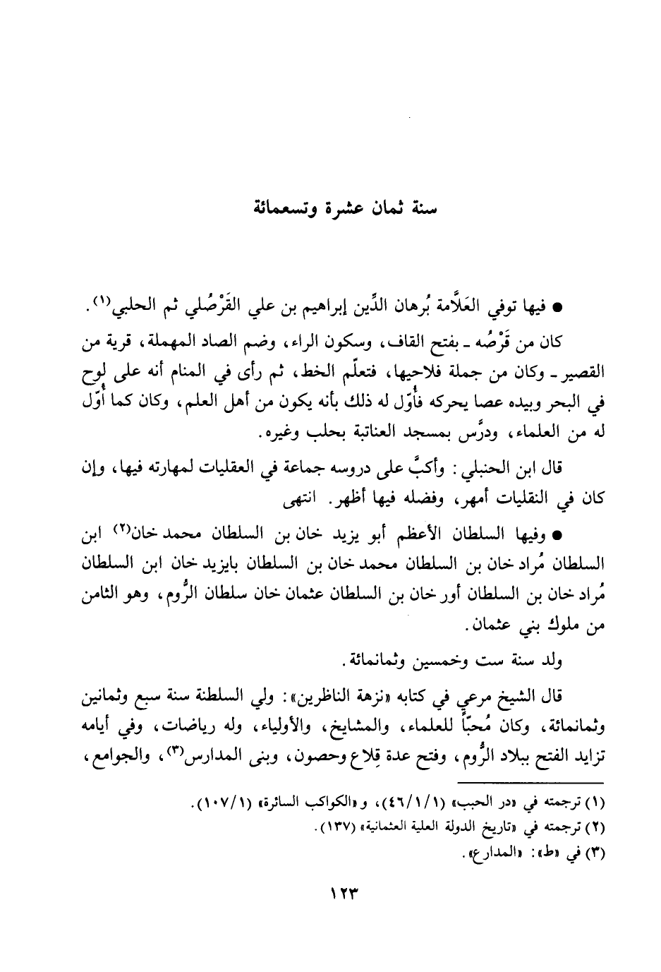 قال ابن الحنبلي: وأكبّ على دروسه جماعة في العقليات لمهارته فيها، وإن كان في النقليات أمهر، وفضله فيها أظهر. انتهى وفيها السلطان الأعظم أبو يزيد خان بن السلطان محمد خان [2] ابن السلطان مراد خان بن السلطان محمد خان بن السلطان بايزيد خان ابن السلطان مراد خان بن السلطان أورخان بن السلطان عثمان خان سلطان الرّوم، وهو الثامن من ملوك بني عثمان.